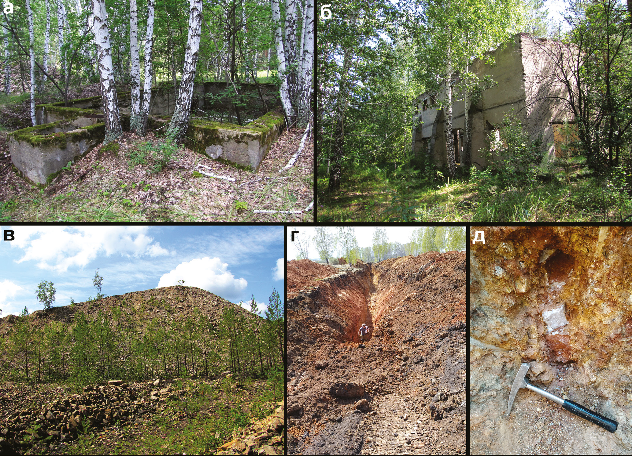 Fig. 1. Modern view of the Yugo-Konevo (а–в) and Porokhovskoe (г, д) deposits: а, б – fragments of mine buildings, photo by S.Yu. Krukov; в – dumps of Yugo-Konevo deposit, photo by A.M. Kuznetsov; г – exploration trench; д – ore-bearing muscovite-quartz vein in the trench wall, photo by K.A. Novoselov.