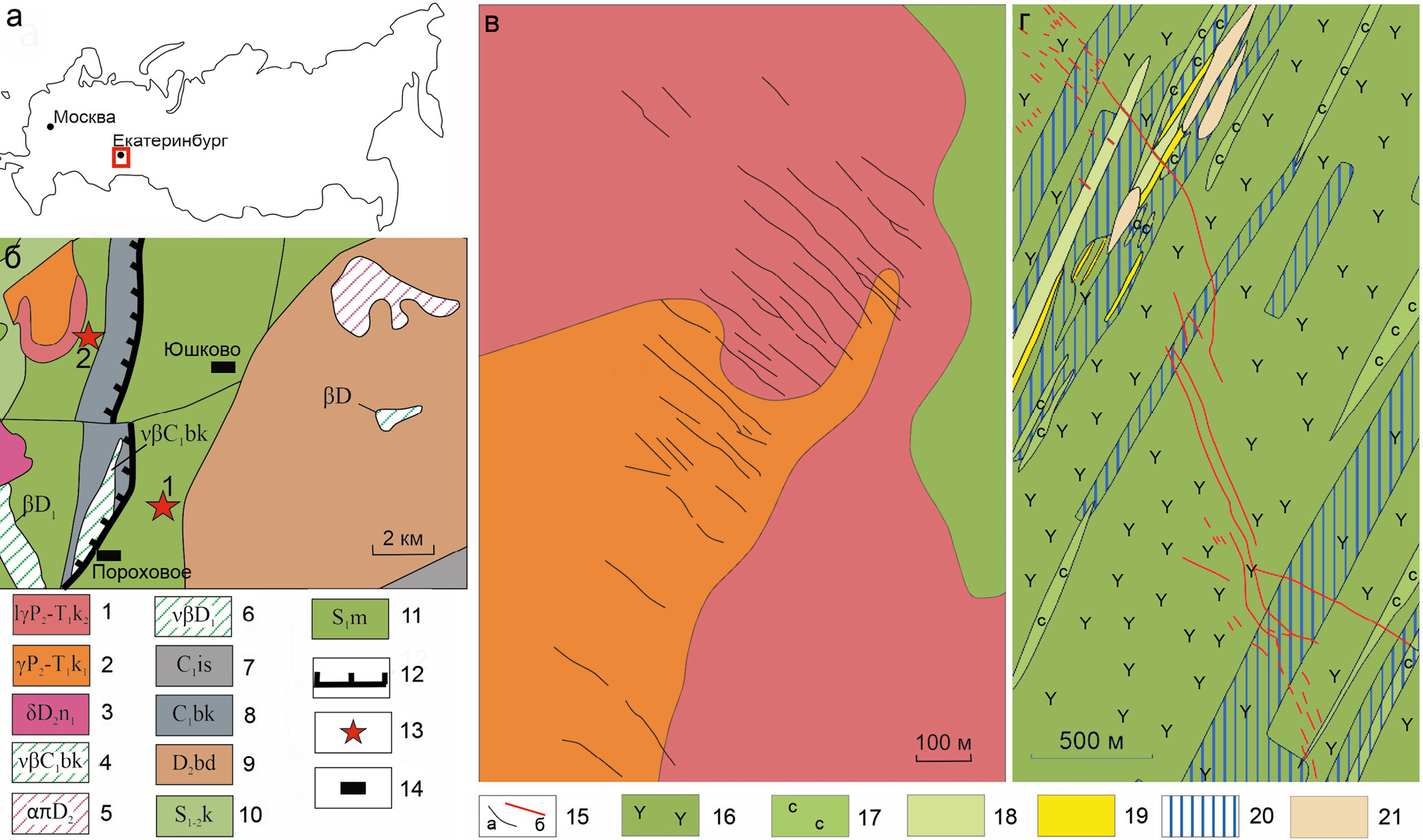 1, 2 – Yugo-Konevo granite-leucogranite complex: 1 – leucogranite of the second phase, 2 – granite and granodiorite of the first phase; 3 – gabbro and diorite of the Nekrasovsky complex; 4–6 – dikes of gabbrodolerite and dolerite (4), diorite porphyrite (5) and dolerite (6); 7 – limestone of the Iset Sequence; 8 – sandstone, siltstone, basalt, andesite and their tuffs of the Beklenishchevo Sequence; 9 – basalt, dacite; 10 – mica-quartz schist; 11 – basalt, andesite, dacite and their tuffs of the Mezhevskaya Sequence; 12 – Kodin thrust; 13 – deposits: 1 – Yugo-Konevo, 2 – Porokhovskoe; 14 – settlements; 15 – ore veins: а – for Fig. 2в, б – for Fig. 2г; 16 – metaandesite; 17 – schist after tuff; 18 – marble; 19 – skarns 20 – zones of chlorite-epidote alteration; 21 – karst cavities.
