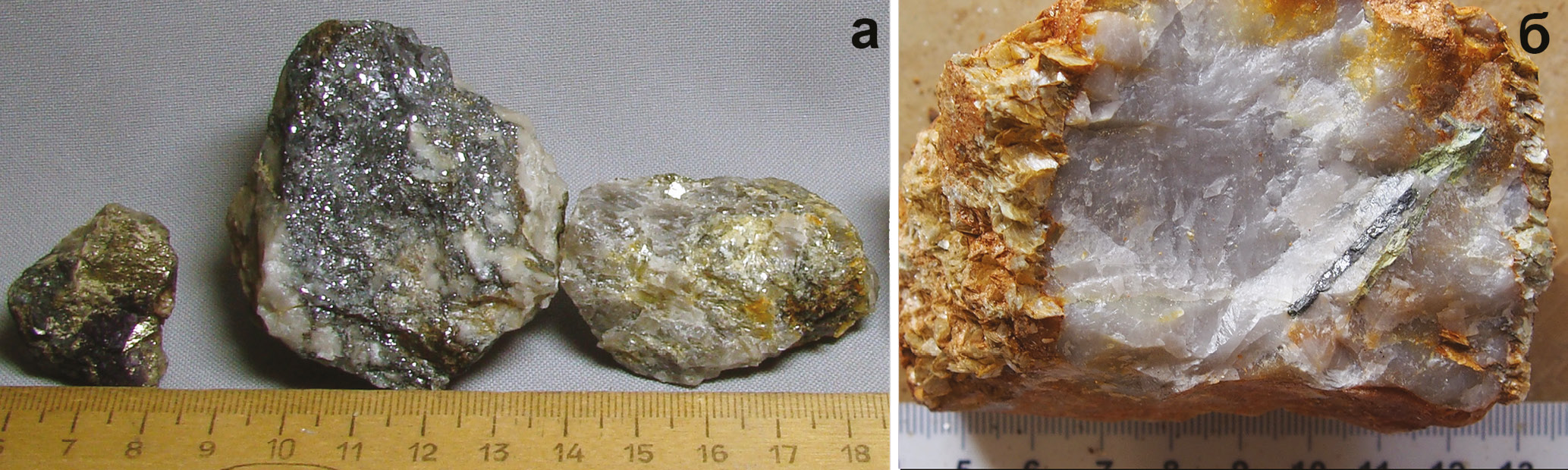 Fig. 3. Samples with visible bismuth mineralization: a – assemblage of Bi sulfosalts in muscovite-quartz veins of the Yugo-Konevo, photo by A.M. Kuznetsov; б – aikinite in a quartz vein with a muscovite rim of the Porokhovskoye deposit, photo by K.A. Novoselov.