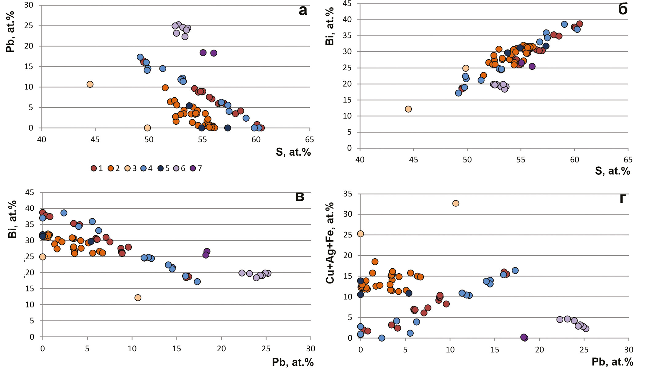Fig. 7. Binary plots showing the diversity of chemical composition of Bi-sulfosalts of the Yugo-Konevo (1–3) and Porokhovskoe (4–7) deposits.