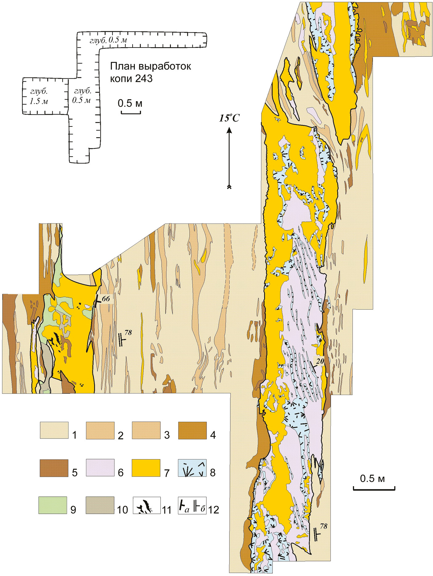 Копь № 243 находится в фенитовом ореоле на юго-восточном контакте Селянкинского сиенитового массива (рис. 1). Поперечной канавой и продольными расчистками обнажены две жилы сиенит-пегматитов (рис. 2). Жилы залегают в висячем юго-восточном боку Селянкинского массива вблизи его контакта с вмещающими гнейсами и амфиболитами селянкинской толщи. Данный массив входит в зону Центральной щелочной полосы, он прослеживается от северного окончания Ильменогорского миаскитового массива на север на 15 км при ширине полосы до 1.2 км (Левин и др., 1974). Геологическое описание Селянкинского массива приведено в работе А.Г. Баженова и др. (1976).