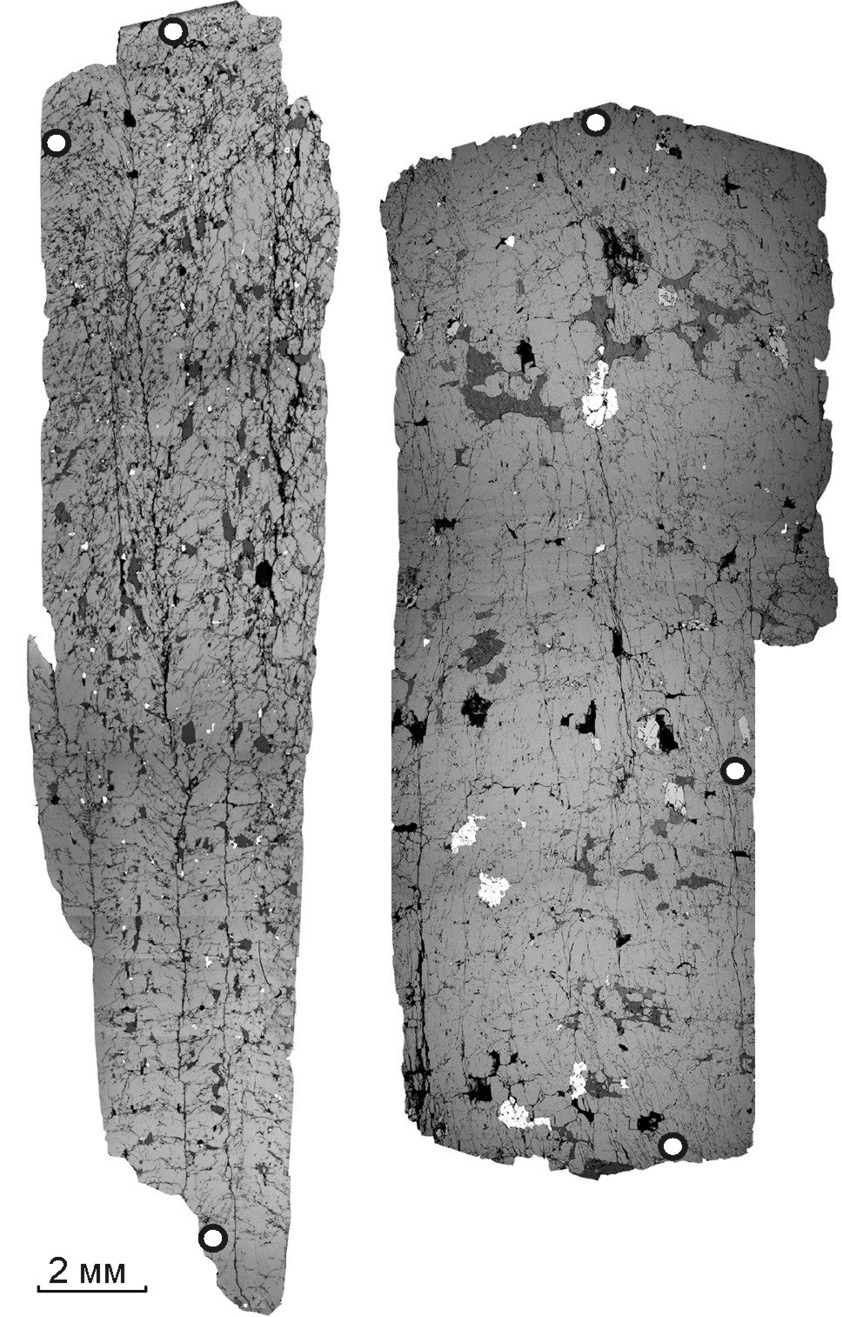 Электронно-микроскопические исследования проведены М.А. Рассомахиным с помощью СЭМ Tescan Vega 3 sbu с ЭДС приставкой Oxford Instruments X-act. Анализы выполнялись при ускоряющем напряжении 20 кВ, токе зонда 15 нА и диаметре пучка электронов 1 мкм; время счета 120 с. Количественный анализ составов произведен с использованием эталонов сертифицированных стандартов № 1362 (Microanalysis Consultant Ltd), MINM25-53 (Astimes Scientific Limited, серийный номер 01-044) и НЭРМА.ГЕО1.25.10.7417. Расчет кристаллохимических формул выполнен Е.П. Макагоновым.