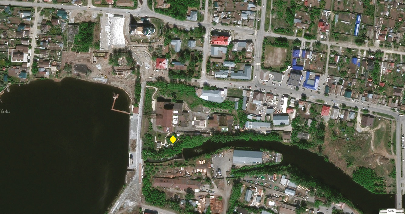 Рис. 1. Расположение железоделательного завода в центре г. Сысерть. Место отбора шлака указано ромбом (дано с использованием Яндекс.Карты).