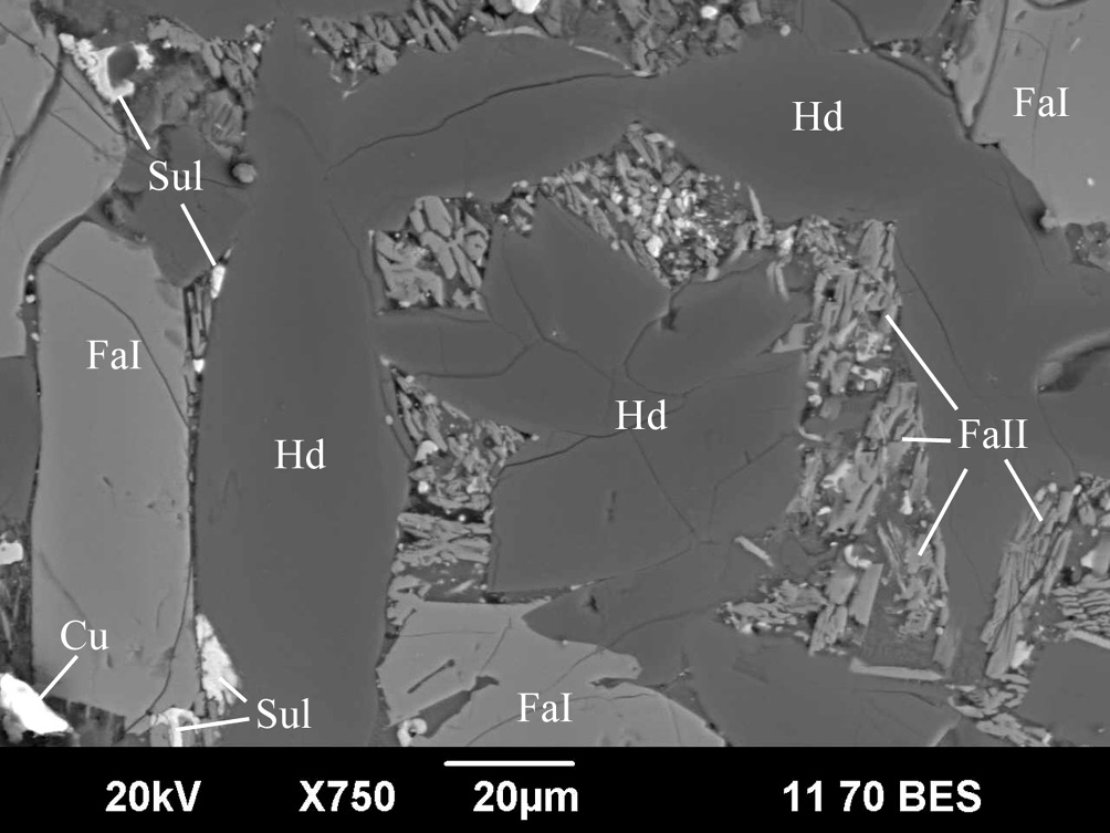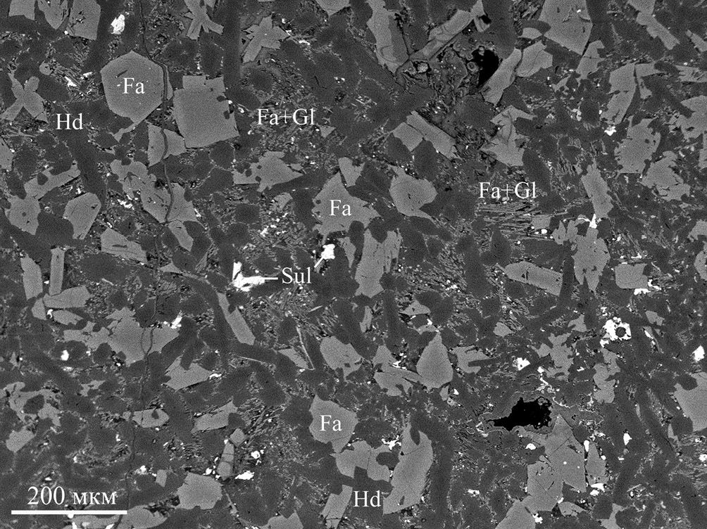 Fa – fayalite, Hd – hedenbergite, Sul – sulfides, Gl – glass. Here and in Figs. 4–8, BSE-images.