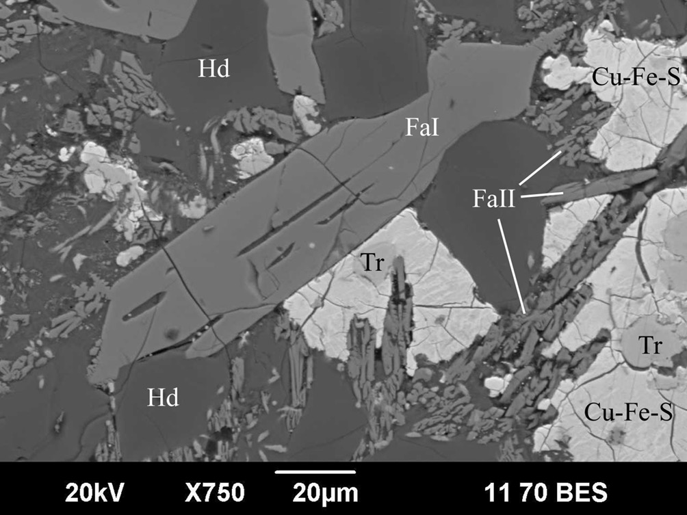 Рис. 4. Индивиды фаялита генерации I (FaI) и II (FaII) с геденбергитом (Hd), троилитом (Tr) и сульфидами Cu и Fe (Cu-Fe-S) в медном шлаке.