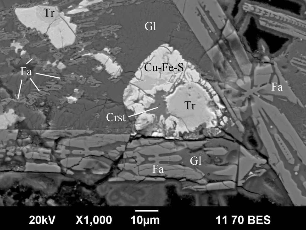 Стекло встречается по всей матрице шлака в интерстициях крупных индивидов фаялита и геденбергита. Оно находится в парагенезисе с фаялитом II генерации в резко подчиненном количестве. Содержание стекла в шлаке не превышает 2–3 об. %. В BSE-режиме (рис. 7) оно выглядит однородным и имеет следующий химический состав (мас. %): SO3 1.57, SiO2 42.14, Al2O3 10.86, FeO 27.42, CuO 2.18, CaO 11.67, K2O 2.17, сумма 99.01. По соотношению кремнезема и щелочей, стекло на диаграмме TAS для вулканитов относится к ряду ультраосновных пород, попадая в область умеренно-щелочных пикробазальтов. Примесь S и Cu, по всей видимости, связана с присутствием в стекле тонкодисперсных сульфидов.
