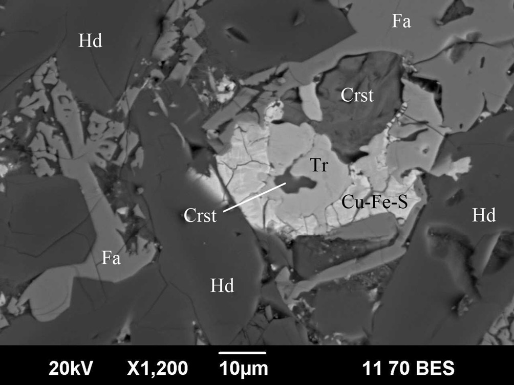 Сульфиды Cu-Fe-S также встречаются в интерстициях между кристаллами геденбергита и фаялита, где ассоциируют с троилитом, халькопиритом, реже с магнетитом. Они являются более поздними по сравнению с троилитом и халькопиритом, т. к. их обрамляют. По химическому составу сульфиды неоднородные и сильно варьируют по содержанию Cu и Fe (табл. 3, ан. 7–10). Наиболее железистые разности тяготеют к скоплениям троилита и халькопирита. Природные соединения с такими составами пока не обнаружены, хотя наиболее медистые разности приближаются к теоретическому составу борнита (табл. 3, ан. 10). Известны так называемые «расплавные твердые растворы» Cu1-xFe2+yS2-z, которые хорошо изучены экспериментально (Kosyakov, Sinyakova, 2014 и др.) и кристаллизуются в широком диапазоне температур от 1012 до 325ºС.