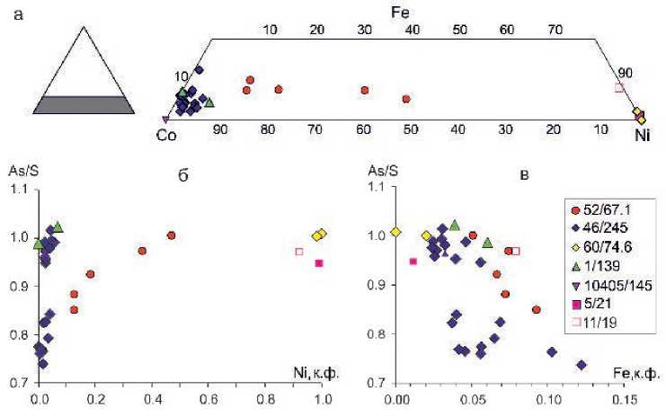 Рис. 3. Диаграммы составов минералов ряда кобальтин–герсдорфит.