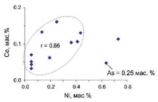 Рис. 5. Диаграмма Co–Ni (мас. %) для пирита (данные из табл. 2).
