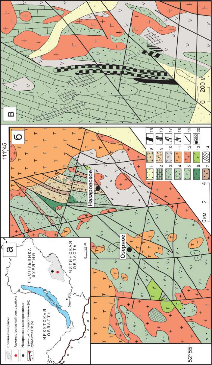Рис. 1. Схемы географического положения Назаровского месторождения (а) и геологического строения Озернинского рудного узла, с упрощением по (Гордиенко, Нефедьев, 2015) (б), геологическая карта Назаровского месторождения, с упрощениями по (Нефедьев, 2009) (в).