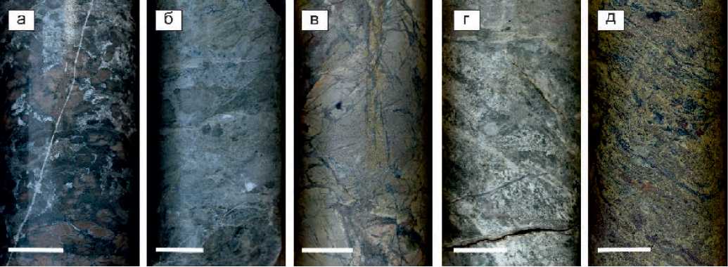 Fig. 2. Calcite-garnet (a), amphibole (б), garnet-amphibole (в), tremolite-wollastonite (г), amphibole-epidote (д) skarns of the northern part of the Nazarovskoe deposit. Scale bar is 2 cm.