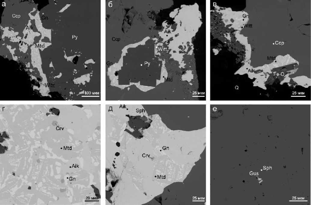 Fig. 6. Relationship of bismuth minerals with each other and with sulfides of the Nazarovsky deposit: a – aggregate of aikinite (Aik), galena (Gn), matildite (Mtd), and wittichenite (Witt) at the contact of pyrite (Py) with chalcopyrite (Ccp); б – aggregate of wittichenite with matildite and galena at contact of pyrite with chalcopyrite and inclusions of aikinite at the contact of chalcopyrite with gangue matrix, в – intergrowth of galena, wittihenite, aikinite, and matildite at the contact of chalcopyrite with quartz (Q) and iron oxides (Fe-O); г – intergrowth of cervellite (Crv), matildite, aikinite, and galena; д – aggregate of aikinite, sphalerite (Sph), galena, cervellite, and matildite in chalcopyrite; e – inclusion of gustavite (Gus) in sphalerite. SEM images.
