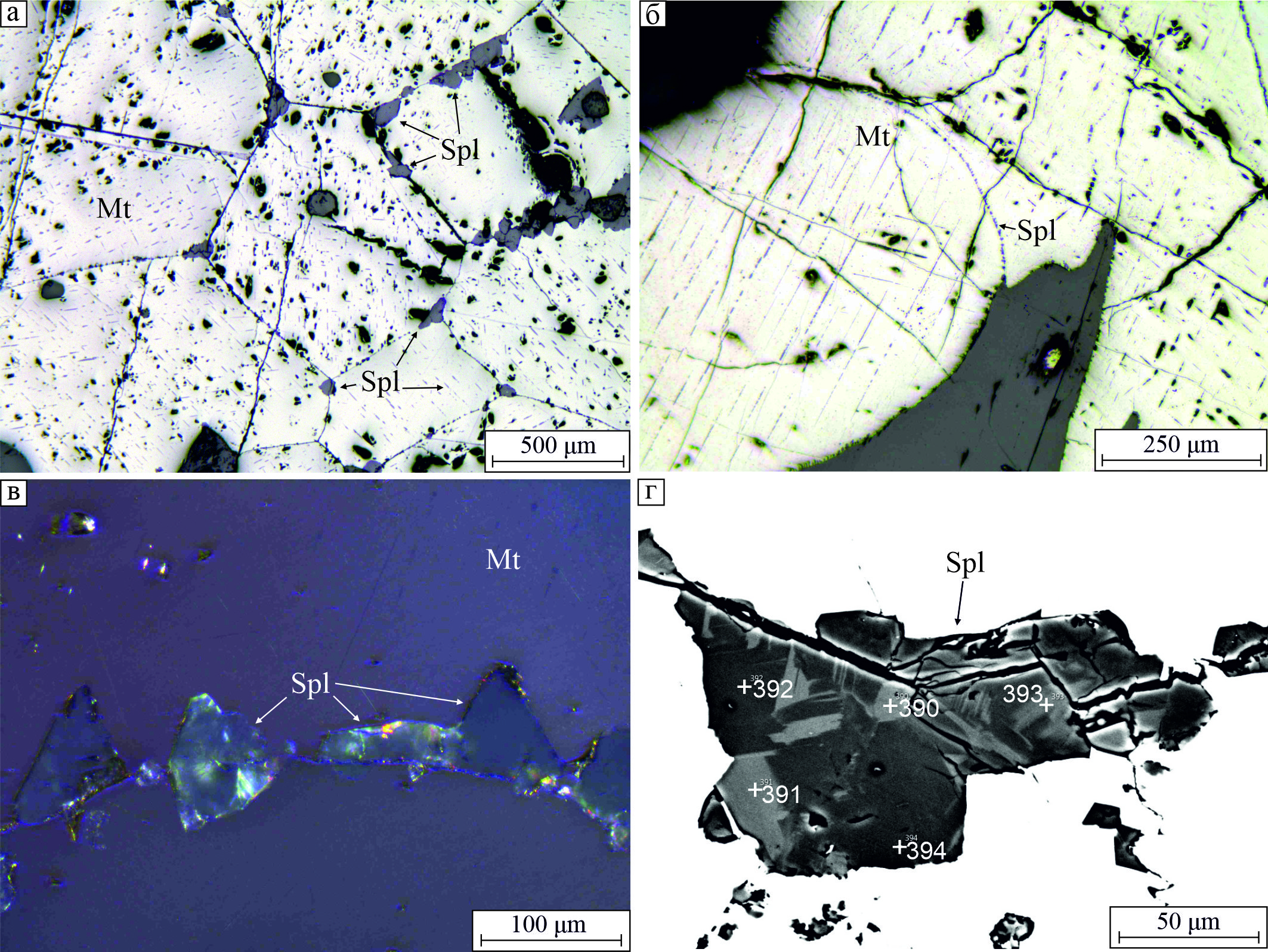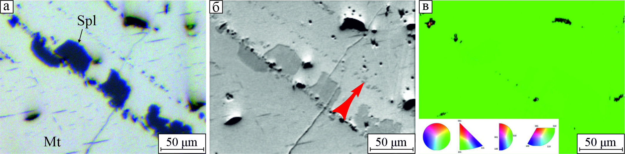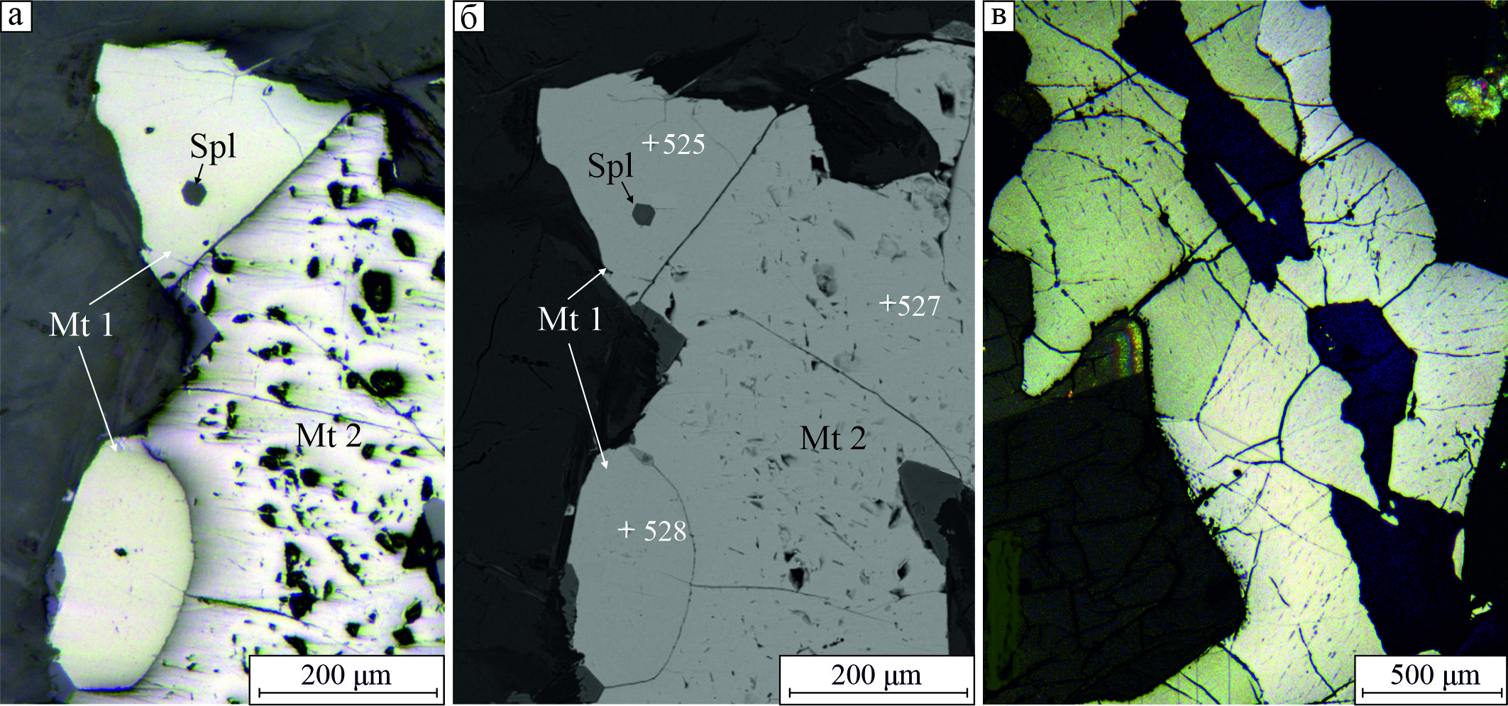 Fig. 1. Two magnetite (Mt) types: а – reflected light; б – BSE-image; в – weak anisotropy of magnetite (reflected light with analyzer). Hereinafter: Spl – spinel.