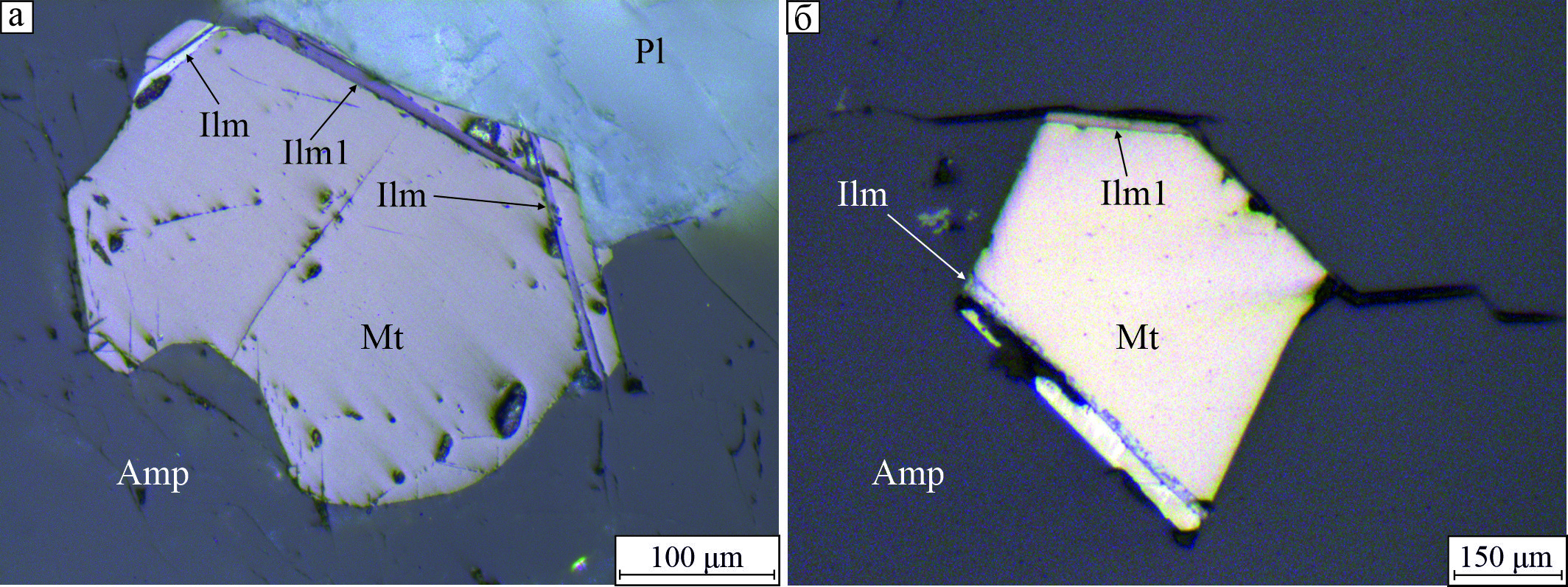 Ильменит является вторым по распространенности рудным минералом. Он содержит незначительное количество примесей кроме MnO, содержание которого достигает 8.61 мас. %. Ильменит встречается чаще всего внутри индивидов магнетита. Редко кристаллы ильменита наблюдаются в породообразующих силикатах (рис. 6). В одном образце отмечено частичное проникновение пластинки ильменита в силикатную матрицу (рис. 6а), в другом – срастание двух закономерно ориентированных равновеликих индивидов магнетита и ильменита в амфиболе, где идиоморфный по отношению к магнетиту ильменит контактировал с амфиболом (рис. 6б).