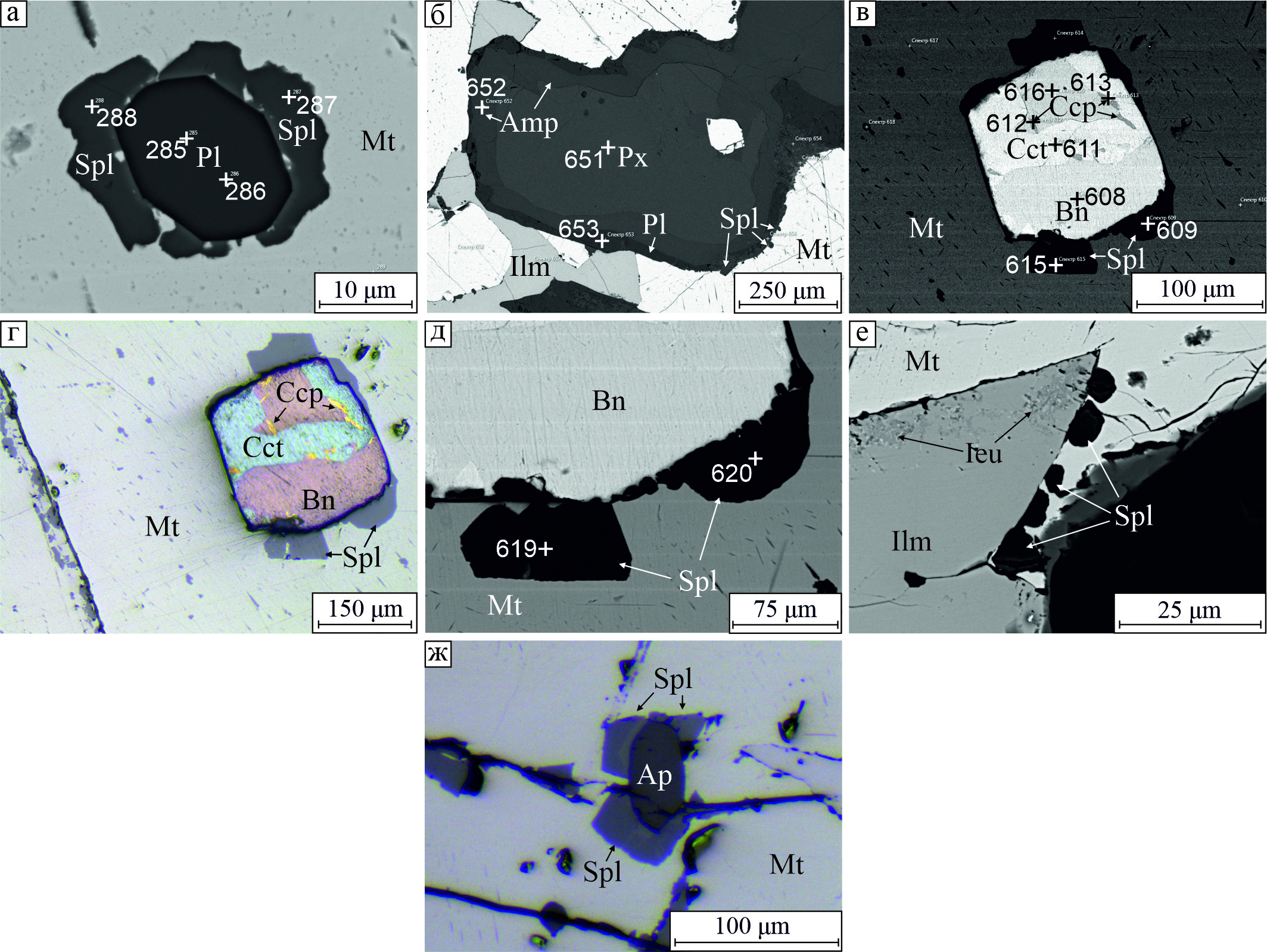 Позиция шпинели и ее взаимоотношения со смежными минералами разнообразны. Широко проявлены линзовидно-пластинчатые и мелкие изометричные выделения в магнетите, которые можно рассматривать как результат распада твердого раствора. Встречаются более крупные выделения шпинели, приуроченные к границам магнетита с другими минералами: плагиоклазом (рис. 17а, б), сульфидами (рис. 17в, г, д), ильменитом (рис. 17е), апатитом (рис. 17ж). В большинстве случаев кристаллы шпинели ксеноморфны по отношению к кристаллам этих минералов и растут в сторону магнетита. Исключением являются индивиды шпинели, приуроченные к границе магнетита с полиминеральным сульфидным включением халькопирит-борнит-дигенитового состава, на границе с которым шпинель развивается преимущественно в сторону магнетита, но частично проникает и в сульфиды (рис. 17д). Предполагается, что такие взаимоотношения связаны с тем, что шпинель зарождалась на границе двух жидких фаз: расплава богатого Fe и P и сульфидного расплава, поэтому могла при преобладающем росте в сторону магнетитового расплава частично оттеснять жидкую сульфидную фазу. Сульфидный расплав в процессе кристаллизации магнетита была захвачен в полость в виде отрицательного кристалла, что и определило форму сульфидного выделения после кристаллизации. Иногда такие «идиоморфные» кристаллы сульфидов принимаются за ранние образования (Полтавец и др., 2011, рис. 5д), хотя предполагается, что сферические выделения борнита в окружении породообразующих минералов габбро – это реликтовые формы сульфидных капель, большая часть которых к моменту коалесценции начала терять сферическую форму. Подобные включения халькопирита в магнетите в виде отрицательных кристаллов известны в магнетит-амфиболовых клинопироксенитах массива Туламин (Nixon, James, 2018, рис. 1а, б).
