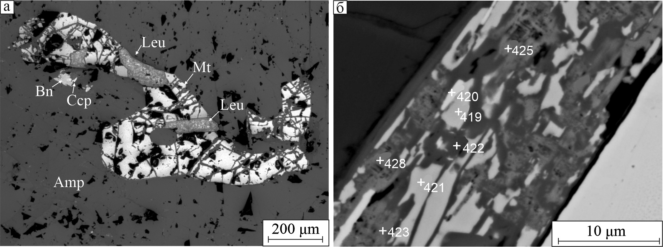 Кристаллизация силикатов и рудных минералов происходила относительно автономно. Среди силикатов первым кристаллизовался анортит № 85–90, а затем клинопироксен, который еще на магматическом этапе частично замещался или обрастал амфиболом. Иногда отмечается обрастание зональных пироксен-амфиболовых выделений поздним анортитом (рис. 17б). Гетерогенное зарождение кристаллов ильменита и шпинели сначала происходило на границах жидких фаз: силикатной и железооксидной, сульфидной и железооксидной. Эти границы обычно не плоскогранные, а округлые, что предполагает возможность зарождения части кристаллов ильменита и шпинели по фазовым границам силикатного и железооксидного расплава еще до кристаллизации основной части силикатов. Отмечено распределение кристаллов шпинели по округлым границам, разделяющим разноориентированные индивиды магнетита, что свидетельствует о возможности возникновения неоднородностей внутри железооксидного расплава при появлении в нем многочисленных мелких шпинелевых фаз.