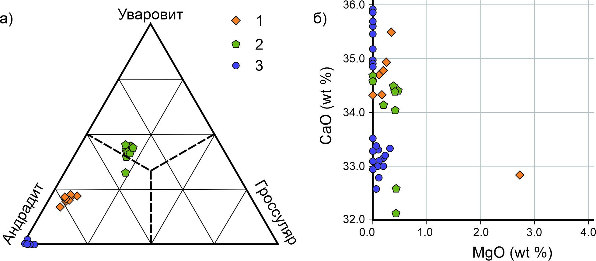 Fig. 8. Composition of garnets from miarolitic dunite (1), chromitites (2) and metasomatites after dunites (3) of the Nizhny Tagil massif: a – contents of the andradite-grossular-uvarovite end-member; б – concentrations of transiting elements in garnets. Here and Fig. 10, diagrams are composed after (Schwasrzinger, 2019).