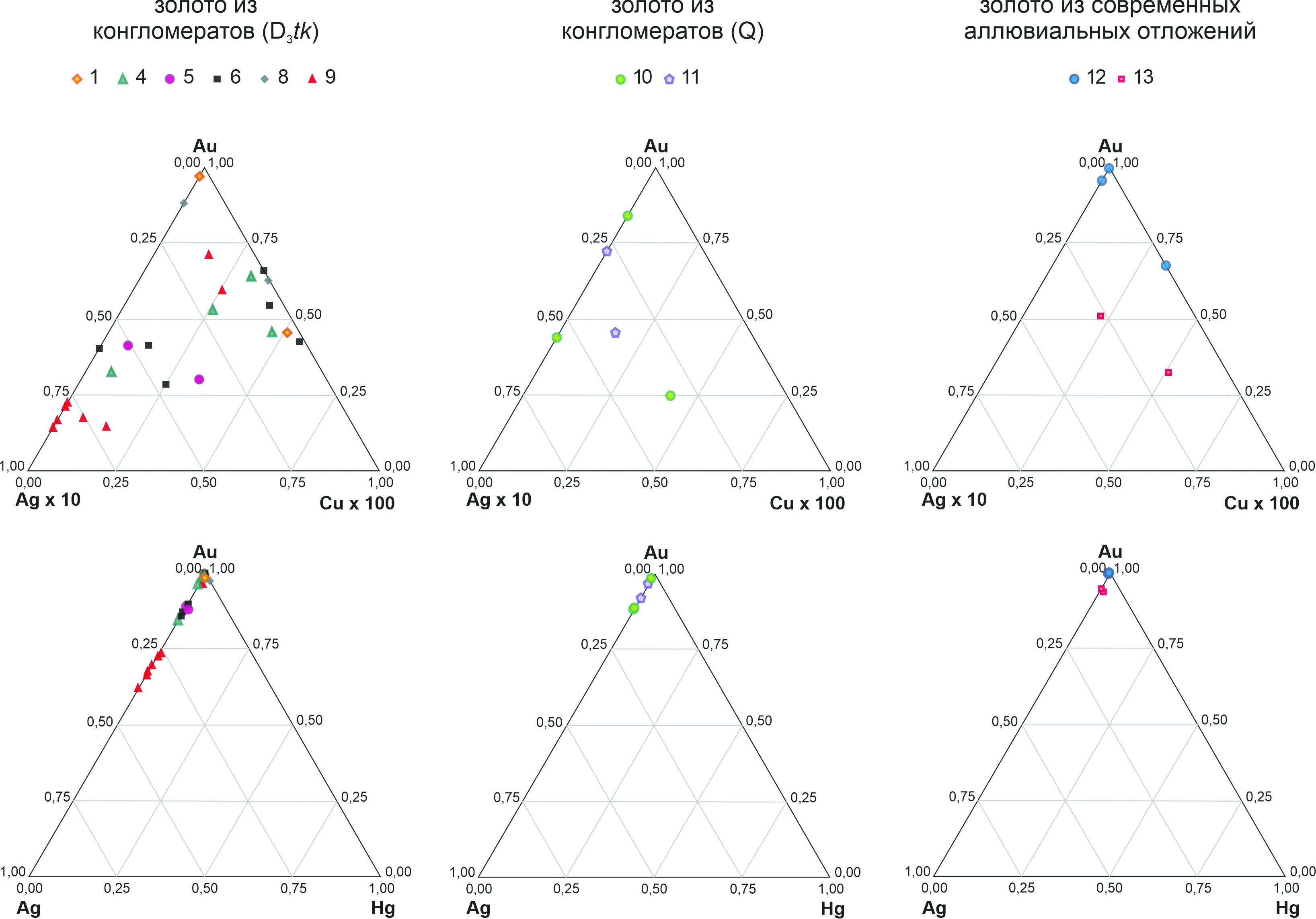 По составу самородное золото высокой и средней пробности (Петровская, 1973). Все проанализированные зерна самородного золота содержат Ag (до 24.81 мас. %), Cu (до 0.50 мас. %) и Hg (до 2.66 мас. %) (табл. 2, рис. 8). Золото из современных отложений характеризуется самой высокой пробностью (951–1000 ‰): Au 93.80–97.00 мас. %, Ag 0.00–2.78 мас. %, Cu 0.00–0.47 мас. %, Hg 0.00– 1.69 мас. %. Самородное золото из конгломератов четвертичного возраста имеет несколько более низкую пробность (924–990 ‰), преимущественно, за счет более высокого содержания Ag : Au 90.99–98.76 мас. %, Ag 1.03–6.73 мас. %, Cu 0.00–0.50 мас. %, Hg 0.00–0.65 мас. %. Состав золота из девонских конгломератов широко варьирует, перекрывая вариации состава золота из более молодых отложений: Au 74.04–100.63 мас. %, Ag 0.00–24.81 мас. %, Cu 0.00–0.40 мас. %, Hg 0.00–2.66 мас. % (рис. 8).