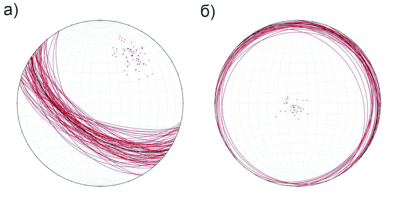 Рис. 2. Стереографические проекции измерений элементов залегания верхнедевонских конгломератов, песчаников и алевролитов таяокуяхинской свиты (D3tk) на нижнюю полусферу по рр. Таяокуяха и Немозягуяха и ручью Безымянный (а, 59 измерений) и р. Мурсейяха (б, 35 измерений).
