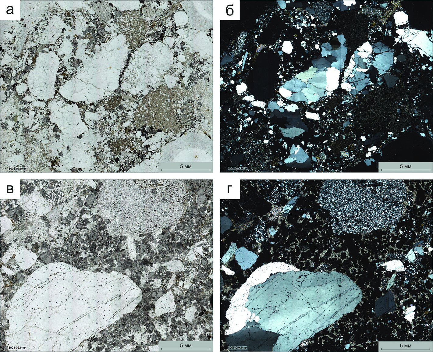 Рис. 4. Конгломерат с карбонатным цементом и высоким содержанием граната: а, в – без анализатора; б, г – с анализатором.