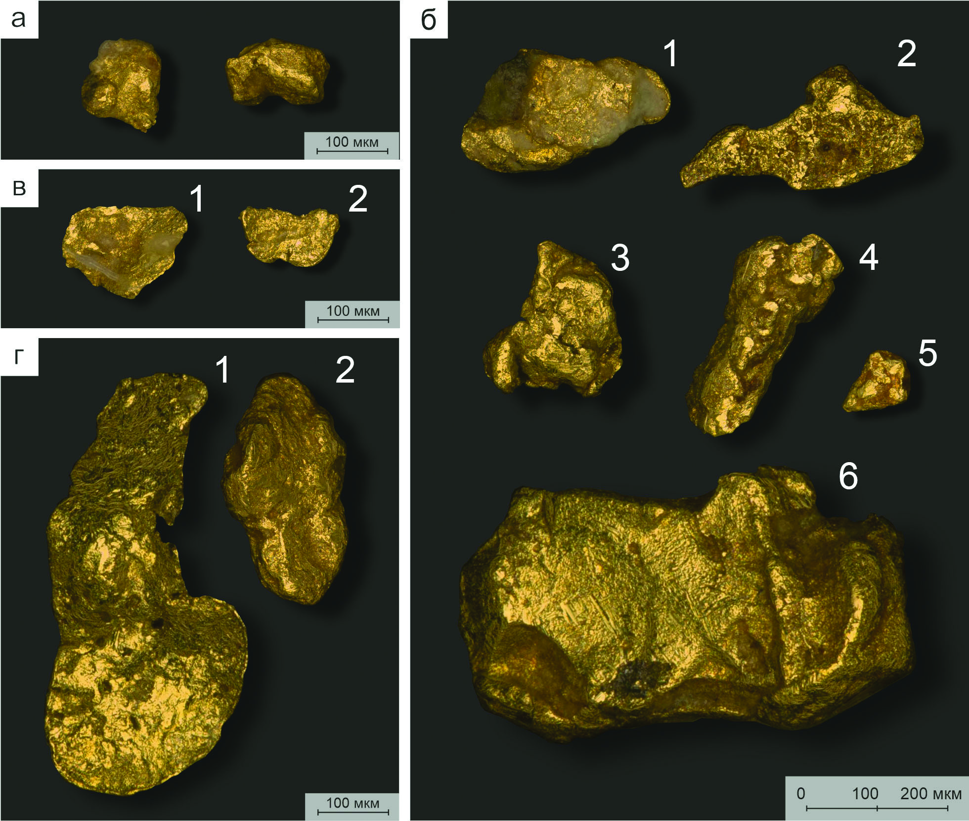 Fig. 6. Native gold from heavy concentrates of primary delithified conglomerates of the Devonian (a – sample 2013-01; б – sample 2014-01), Quaternary age (в – sample 2015-01) and present-day alluvial deposits (г – sample 2014-02).