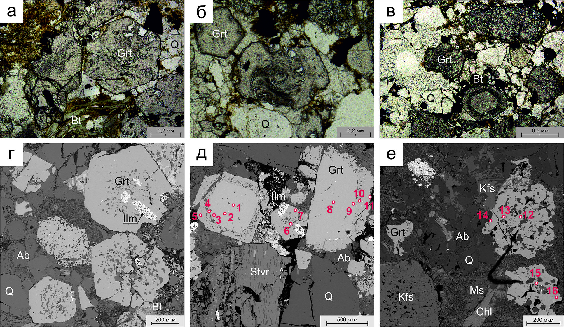 Рис. 9. Зерна граната из конгломератов таяокуяхинской свиты: а–в – проходящий свет; г–е – BSE-фото. д, е – сос-тав приведен в табл. 3.