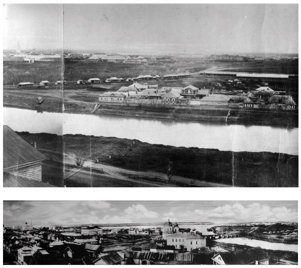 7 Панорамные снимки Омска 1862–1863 гг., снятые, предположительно, с башни здания полицейского управления на совр. ул. Ядринцева (топоним утрачен). На первом снимке вдали виднеется здание Главного управления Западной Сибири, в центре на среднем плане можно разглядеть частокол острога.