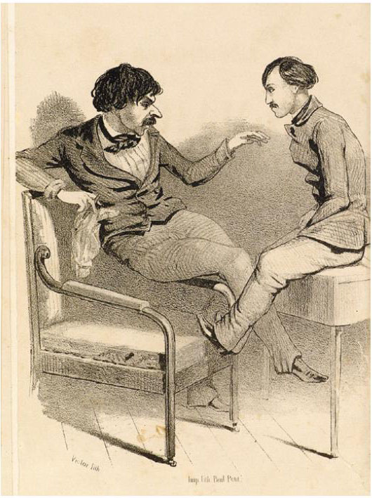 Илл. 10. Журналист и Сотрудник. <А. А. Краевский и Ф. М. Достоевский>. Карикатура. Н. А. Степанов, 1848. С рис. 1847. Литография для «Иллюстрированного Альманаха», изданного Н. Некрасовым и И. Панаевым