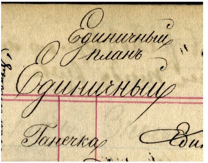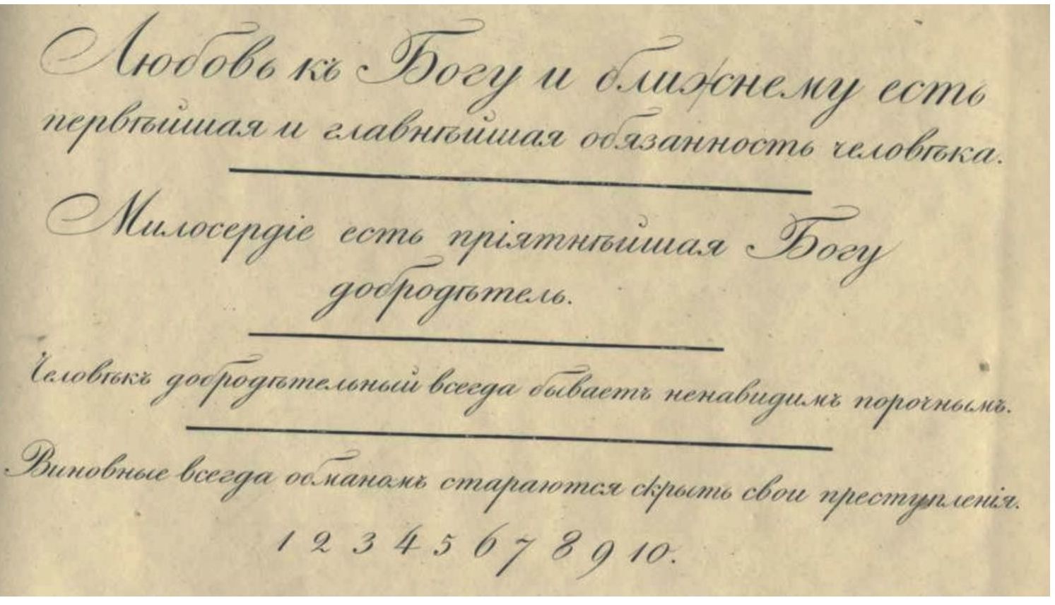 Примеры из учебного пособия В. С. Гербача «Прописи косого и прямого почерков» (Гербач, 1901: 15, 14) (см. также: Печинский):