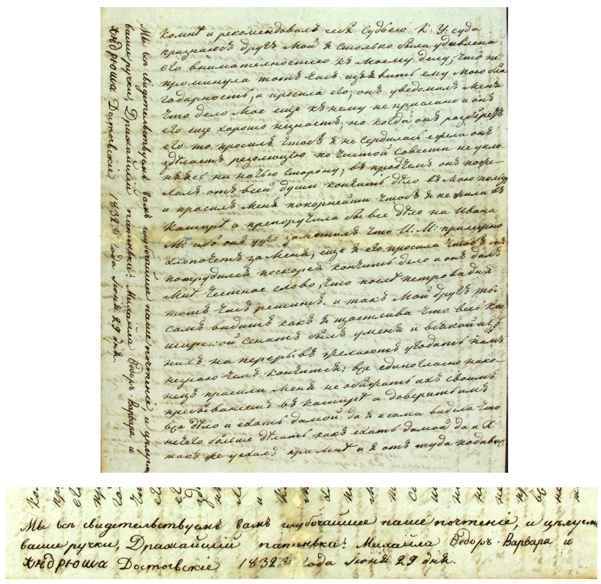 Илл. 2. Письмо М. М. и Ф. М. Достоевских к М. Ф. Достоевской от 23 августа 1833 г. В верхней части записи рукой М. М. Достоевского, в нижней — Ф. М. Достоевского. Тип почерка — скоропись (РО ИРЛИ. Ф. 56. № 376)