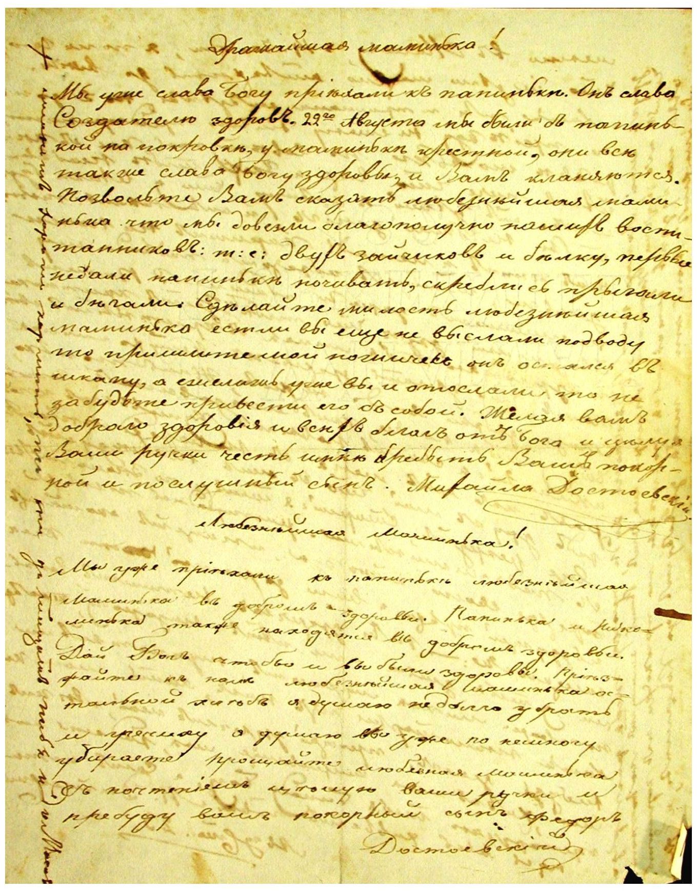 Fig. 2. The letter of M. M. and F. M. Dostoevskys to M. F. Dostoevsky dated August 23, 1833. In the upper part of the recording by M. M. Dostoevsky’s hand, in the lower part by F. M. Dostoevsky. Handwriting type is cursive