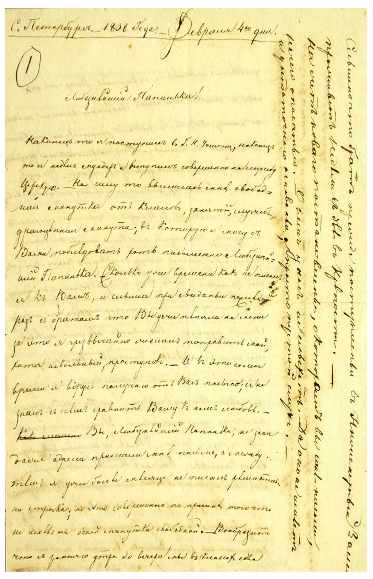 Fig. 5. The first page of F. M. Dostoevsky’s letter to M. A. Dostoevsky dated February 4, 1838. Handwriting type is cursive