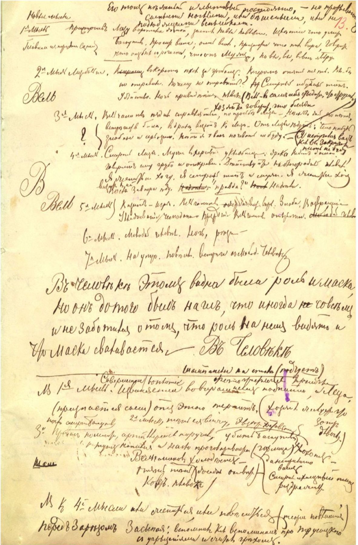 Fig. 6. A page of F. M. Dostoevsky’s notebook, 1869–1870. Types of handwriting are correct cursive, cursive, calligraphy, elements of calligraphy
