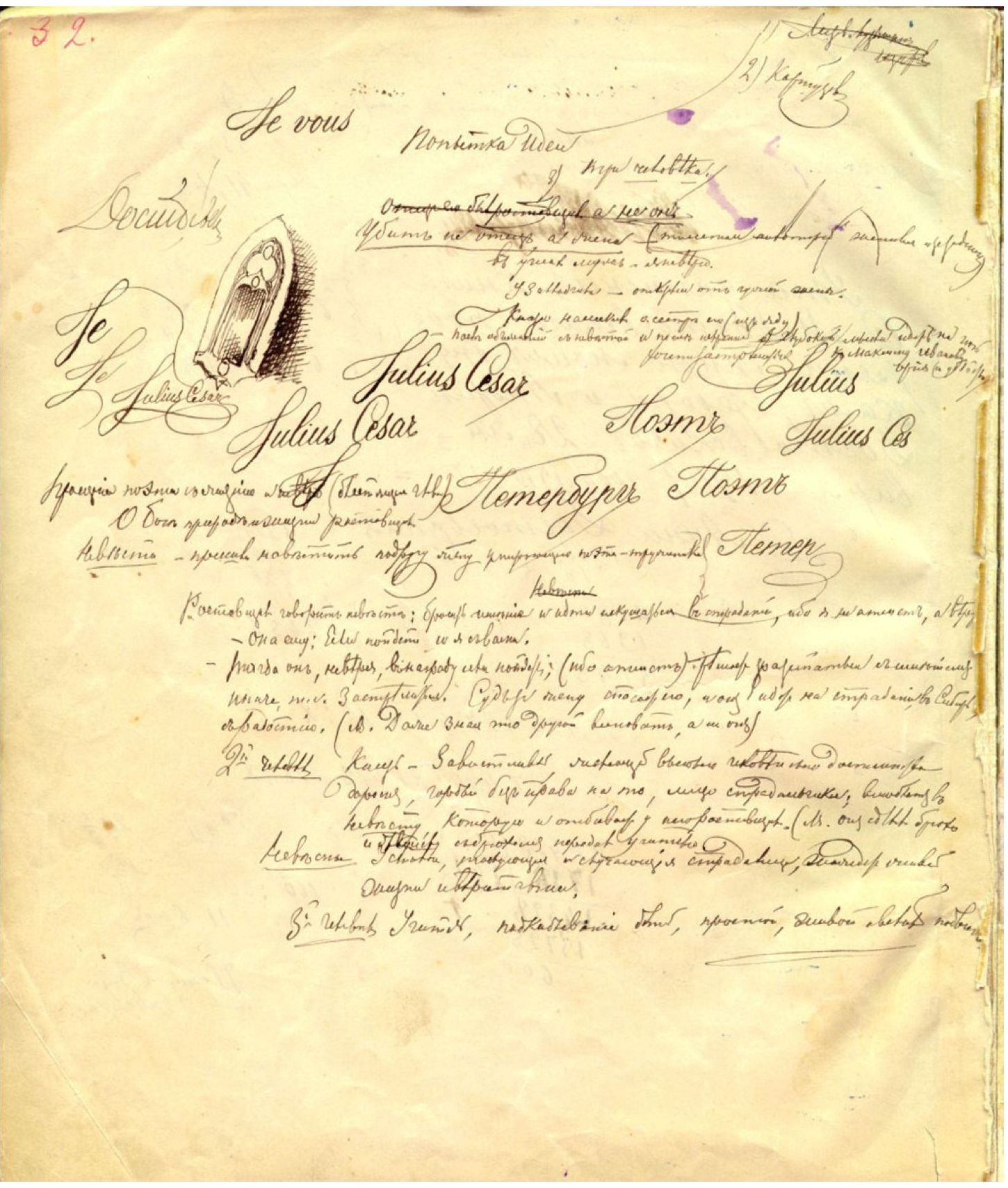 Fig. 7. A page of F. M. Dostoevsky’s notebook, 1869–1870. Types of handwriting are correct cursive, cursive, calligraphy, elements of calligraphy, a fragment of the drawing