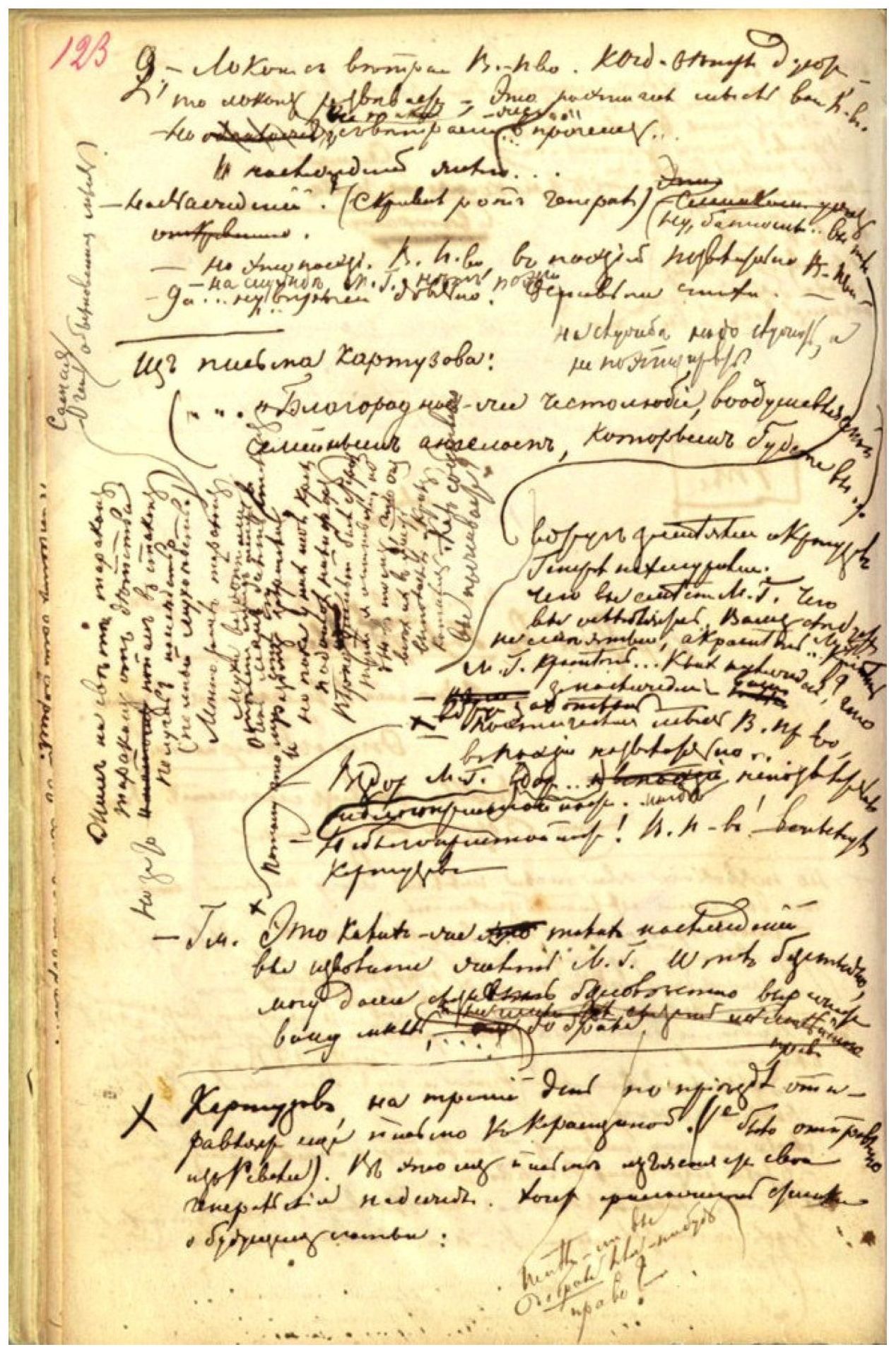 Илл. 10. Страница записной тетради Ф. М. Достоевского 1868–1869 гг. Тип почерка — скоропись (РГАЛИ. Ф. 212.1.7. С. 123)