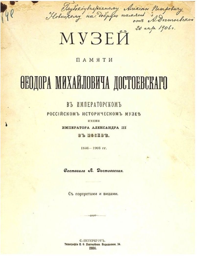 Илл. 6. Титульный лист библиографического указателя «Музей памяти Ф. М. Достоевского», подаренного А. П. Новицкому, с дарственной надписью рукой А. Г. Достоевской34