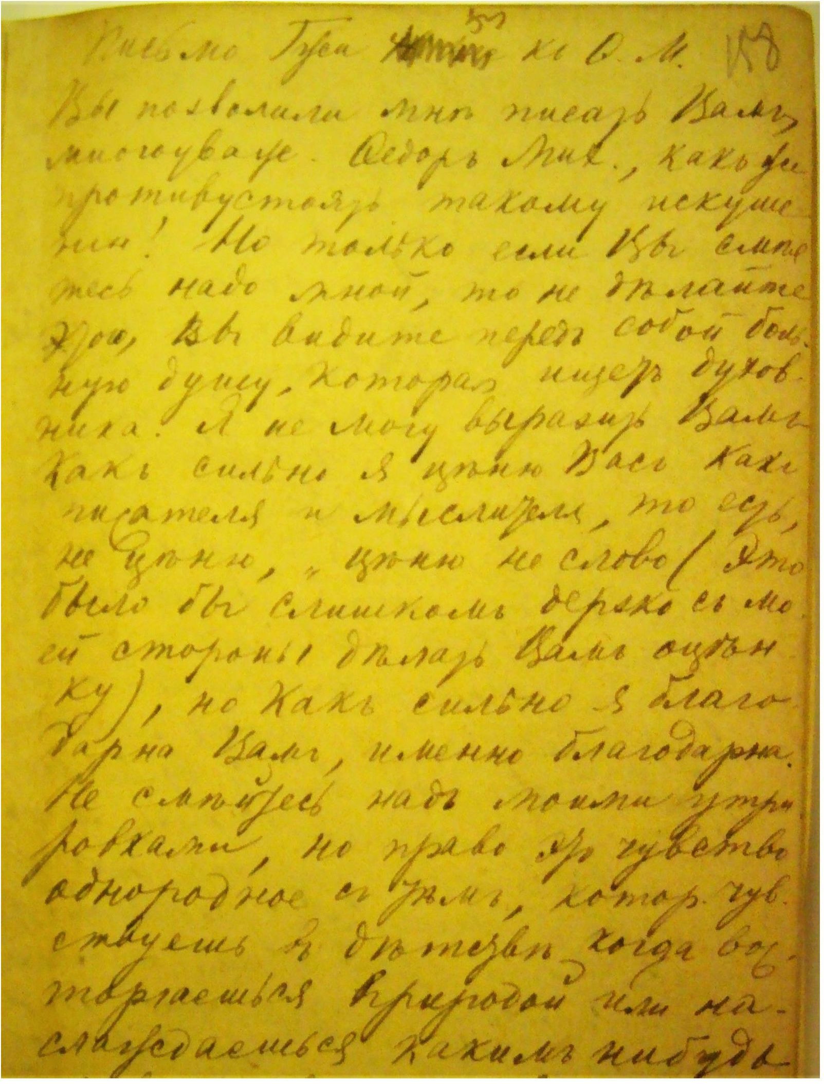 Первое письмо Е. Ф. Юнге к писателю до исчезновения автографа было опубликовано почти полностью28 во вступительной статье к ее воспоминаниям, вышедшим из печати отдельной книгой в 1914 г., через год после ее смерти29. Републикация письма с данного издания была сделана А. С. Долининым в 1959 г.30 До настоящего времени письмо Юнге публиковалось и цитировалось по этим двум изданиям.