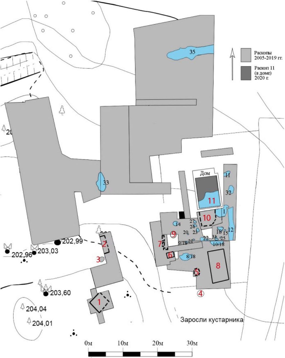 Fig. 1. The scheme of archaeological excavations on the territory of the Darovoe manor in 2005–2020 (published in: [Syrovatko, 2021:149])