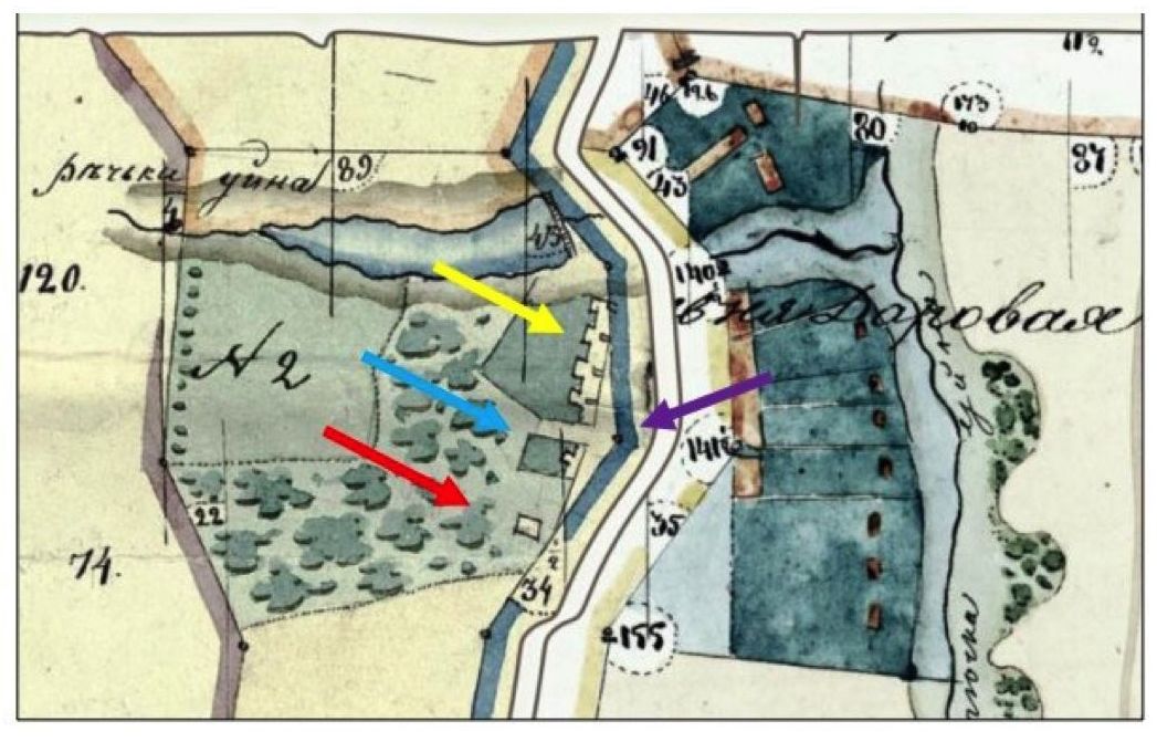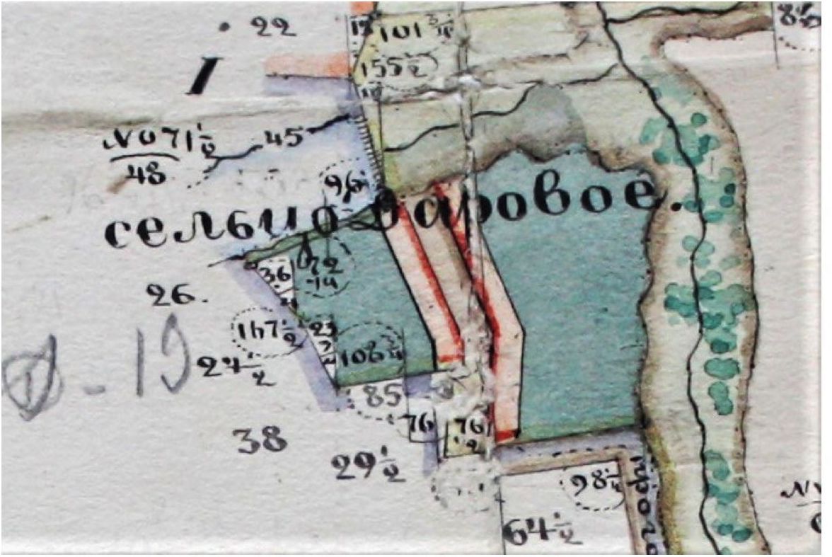 Fig. 2. A Fragment of the “Plan of the parts of the village of Darovoe with the village of Cheremoshnya, allocated to the permanent allotment of the temporarily obligated peasants of the state councilor V. M. Ivanova. 1865” (The State Archive of the Tula region. Fund 291, inventory 72, case 67; published in: [Darovoe Dostoevskogo: color pasting])