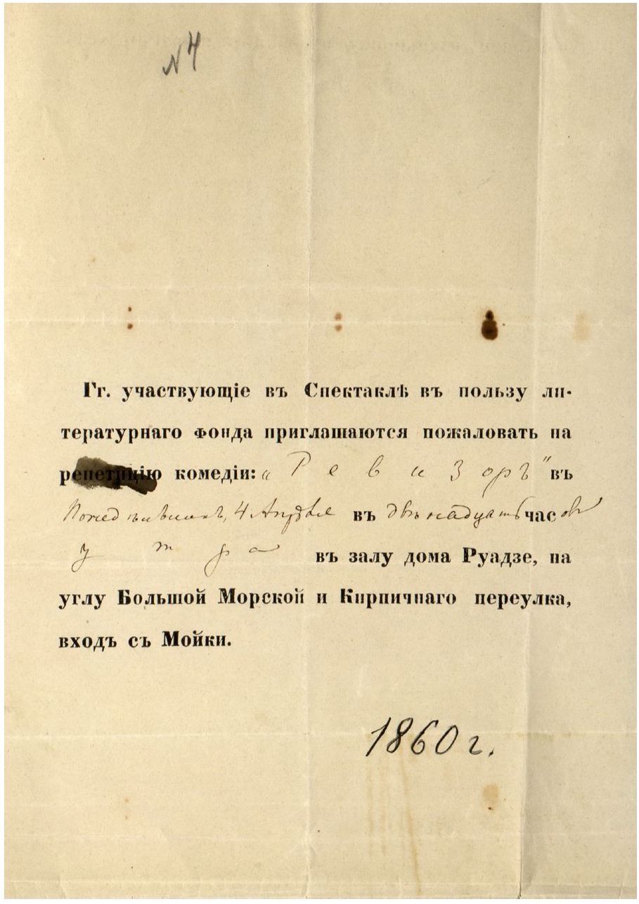 Факт участия Достоевского 14 апреля 1860 г. в благотворительном любительском спектакле — постановке комедии Гоголя «Ревизор», осуществленной по инициативе недавно учрежденного Общества для пособия нуждающимся литераторам и ученым (Литфонд), широко известен. Спектакль этот произвел фурор среди петербургской публики и привлек всеобщий интерес. В качестве актеров в нем, наряду с Достоевским, выступали знаменитые современные писатели: Иван Тургенев, Алексей Писемский, Дмитрий Григорович, Александр Дружинин, поэты Аполлон Майков, Петр Вейнберг, Василий Курочкин, издатель Андрей Краевский и др. Публика просто ломилась в зал Марии Руадзе в ее доме на углу набережной Мойки и Кирпичного переулка у Полицейского моста, где состоялась постановка. «Если бы зала Руадзе была вдвое больше, то и тогда она, вероятно, не вместила бы всех желающих быть на спектакле», — вспоминал один из мемуаристов [Пантелеев, 1958: 230]1.