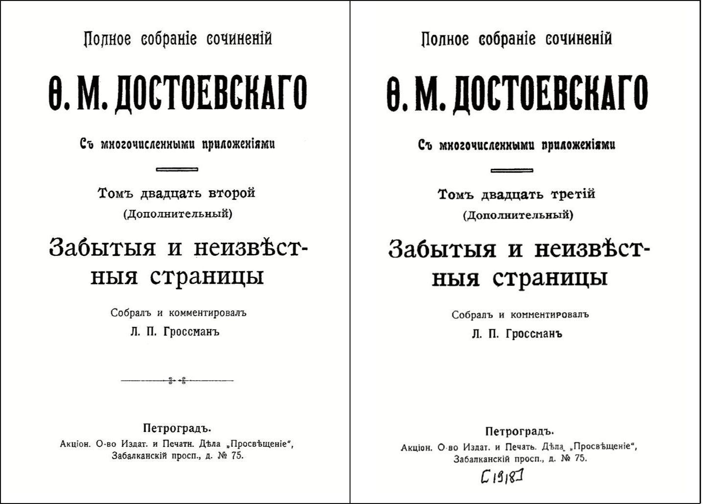 - Grossman L. P. Comments. Additions: Forgotten and Unknown Pages. In: Dostoevskiy F. M. Polnoe sobranie sochineniy: v 23 tomakh [Dostoevsky F. M. The Complete Works: in 23 Vols]. Petrograd, Prosveshchenie Publ., 1918, vol. 22. 279 p.; vol. 23. 525 p. (In Russ.) (b)