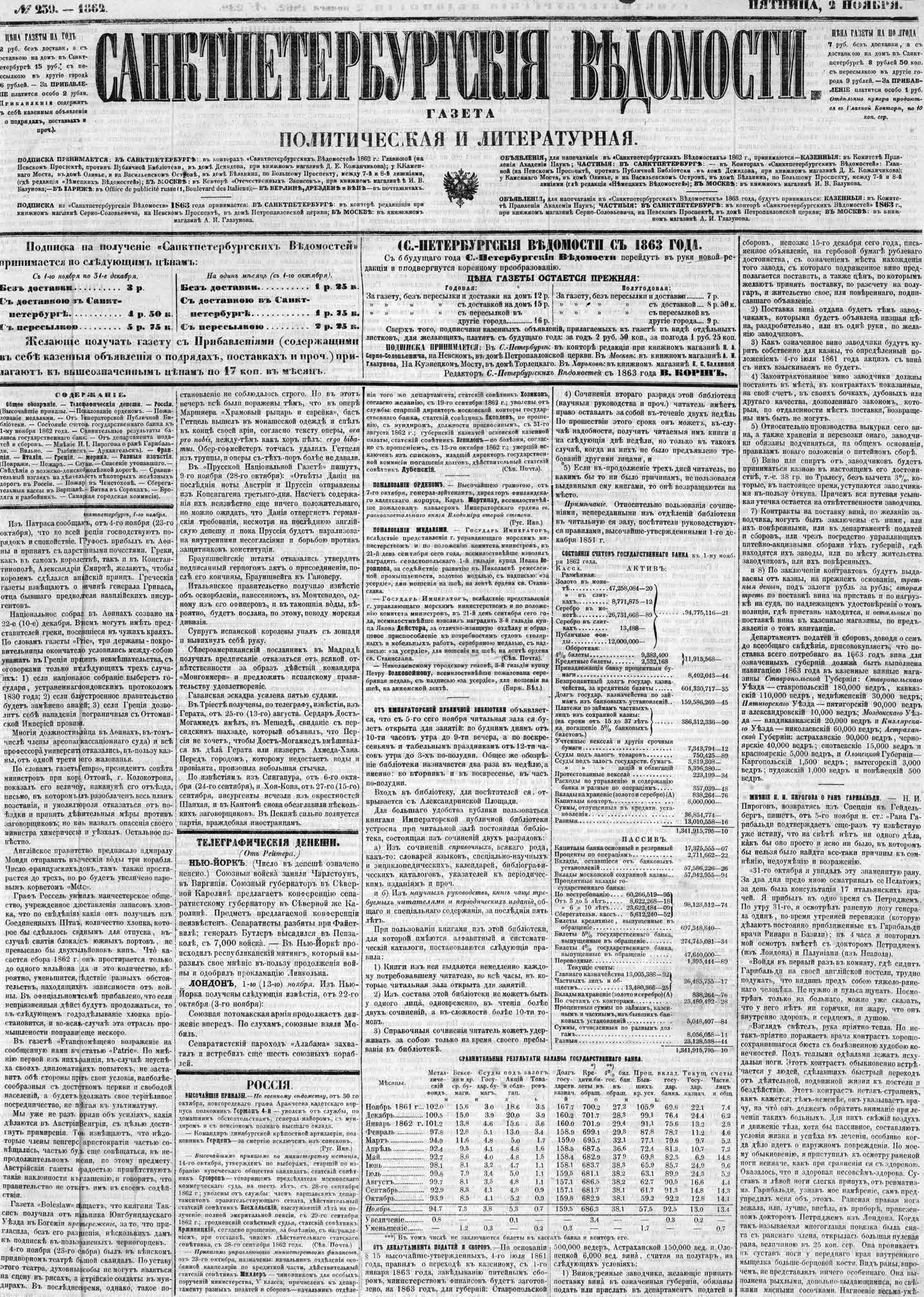 Илл. 4. Первая полоса газеты «Санкт-Петербургские ведомости» (1862. № 239. 2 ноября) с заметкой «Мнение Н. И. Пирогова о ране Гарибальди» (в колонке справа)