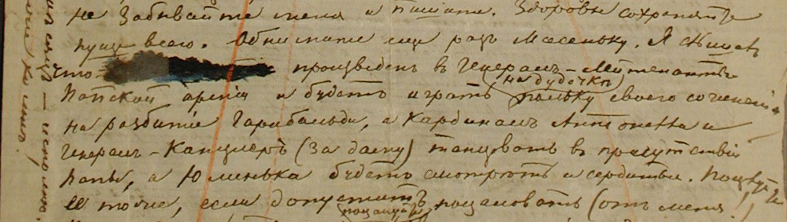 «Обнимите еще разъ Масеньку. Я слышалъ что <1 слово нрзб.> произведенъ въ Генералъ-Лейтенанты Папской арміи и будетъ играть {на дудочкѣ} польку своего сочиненія на разбитіе Гарибальди, а Кардиналъ Антонелли и Генералъ-Канцлеръ (за даму) танцовать въ присутствіи Папы, а Юлинька будетъ смотрѣть и сердиться. Поцалуйте [и] {ее} тоже, если допуститъ поцаловать (отъ меня!) Витю тоже отъ меня {поцалуйте} и хваленаго Лёлю. Затѣмъ всѣхъ; а братцу Александру Александровичу пожмите отъ меня руку покрѣпче»12.