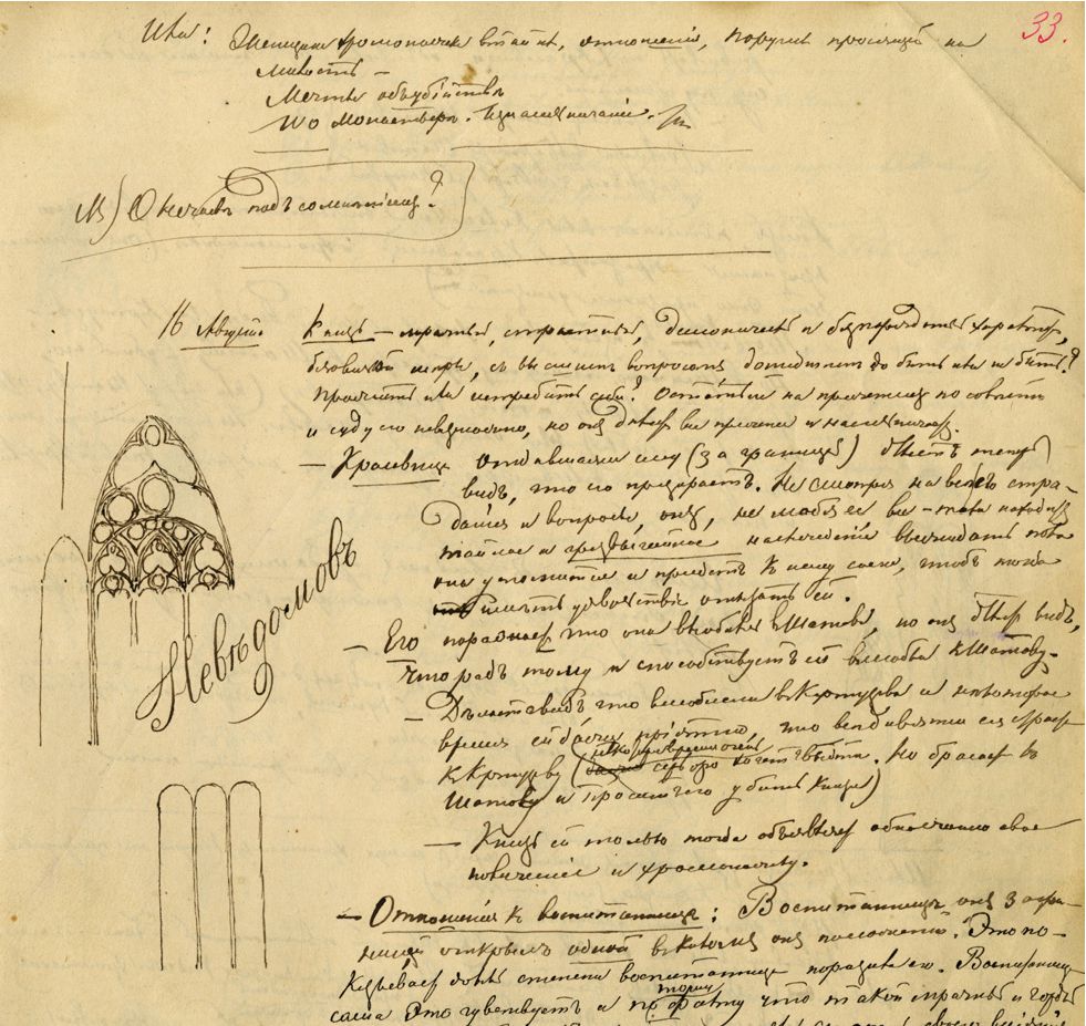В одной из рабочих тетрадей с черновыми набросками к роману Достоевского «Бесы» есть каллиграфическая пропись: «Невѣдомовъ» (РГАЛИ. Ф. 212. 1. 8. С. 33, см. Илл. 1):