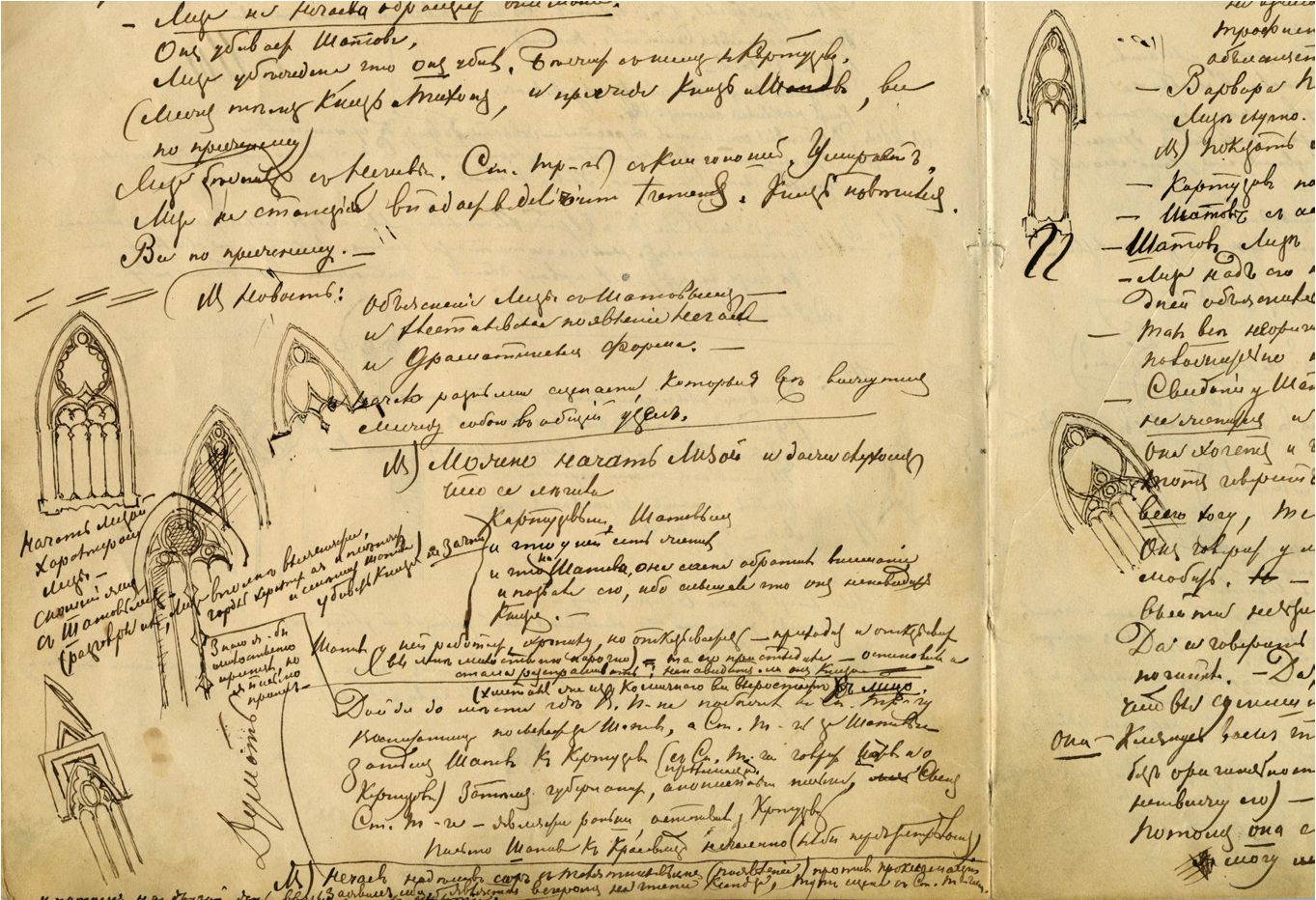Судя по расположению рисунков (архитектурных деталей) в ближайшем контексте, они, как и каллиграфия, появились до того, как напротив них были сделаны записи к роману, — во всяком случае, это касается тех набросков, которые огибают рисунки и каллиграфию или частично нанесены поверх рисунков, как на соседних страницах указанной тетради (см. Илл. 2).