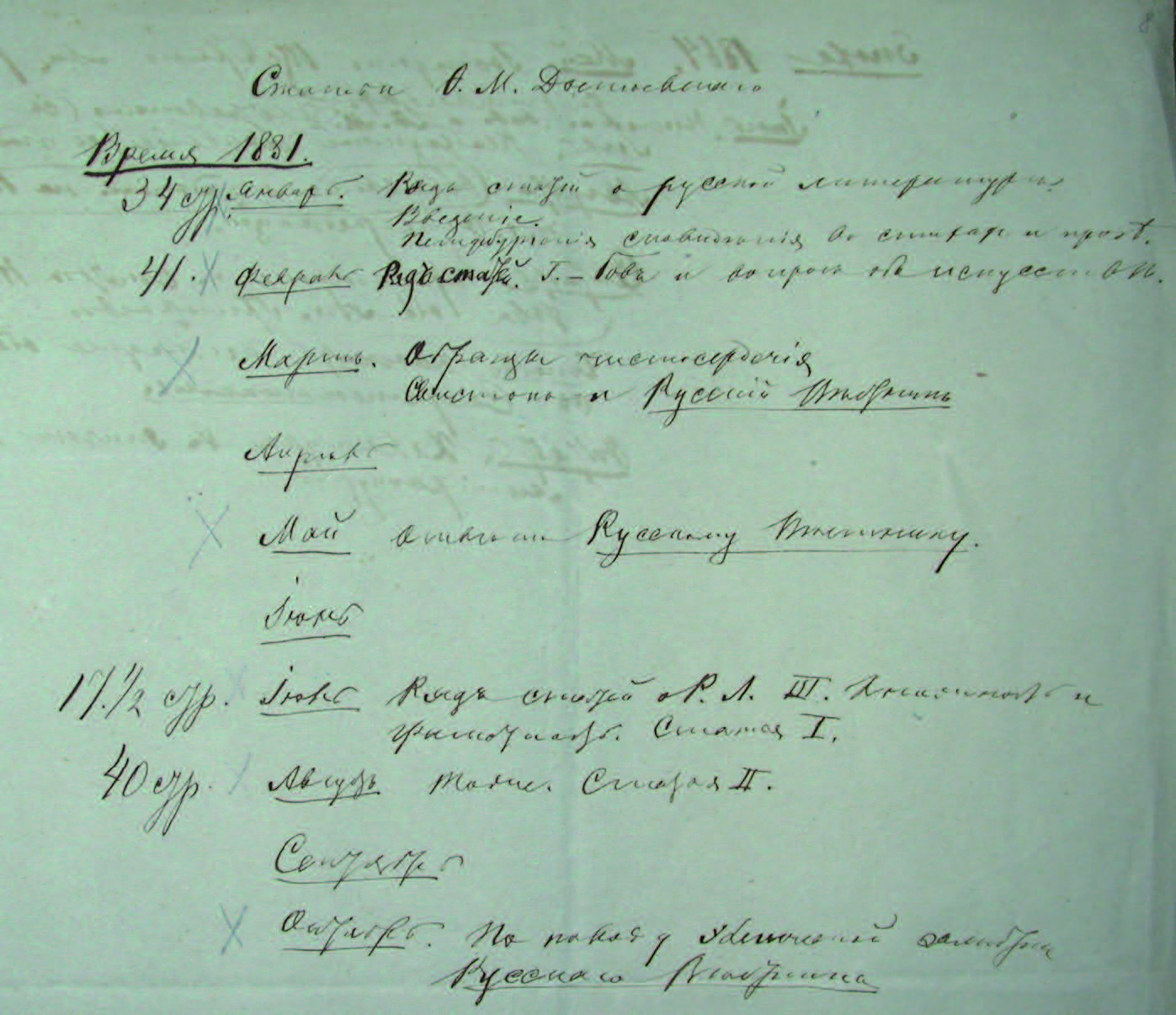Илл. 1. ОРФ ГМИРЛИ. Ф. 81. Оп. 2. Д. 69. Страхов Н. Н. Список анонимных статей Ф. М. Достоевского из журналов «Время» и «Эпоха». 1880е гг. Л. 8. Фрагмент рукописи