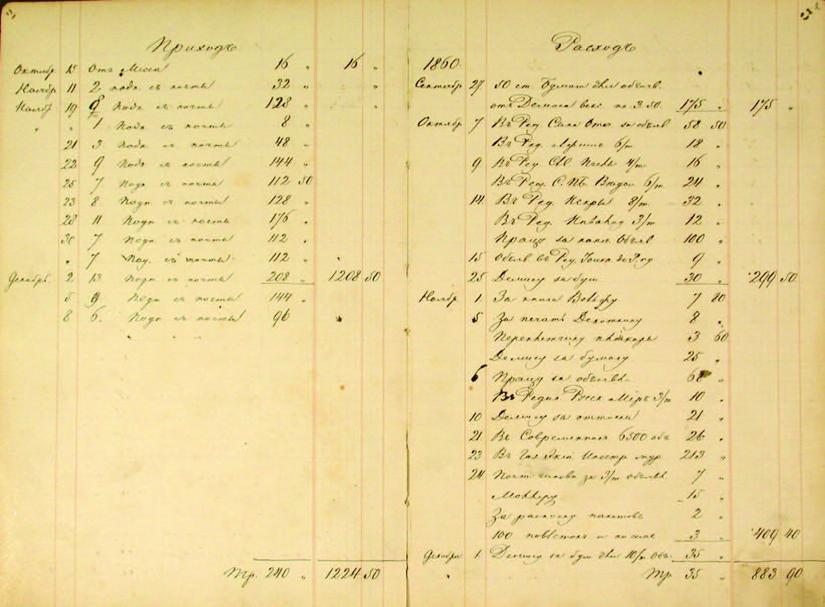 Первая — приходорасходная — книга (ОР РГБ. Ф. 93.I.3.21), имеющая двойную пагинацию — печатную (232 страницы) и рукописную (116 листов), содержит записи на разграфленных страницах по годам, месяцам и числам, на левой стороне разворота (обороты листов / четные страницы) — денежных приходов, или кредит (деньги от подписчиков, из книжных магазинов и т. д.), на правой стороне (лицевые стороны листов / нечетные страницы) — денежных расходов, или дебет (оплата работы сотрудников, гонорары авторам, оплата типографских расходов, корректуры, объявлений, почтовых отправлений и проч.). Внизу страниц подводился баланс прихода и расхода с переносом итоговых сумм на следующую страницу (см. Илл. 2, 2а). По со отношению полученных и потраченных сумм можно судить, насколько успешно шло предприятие.