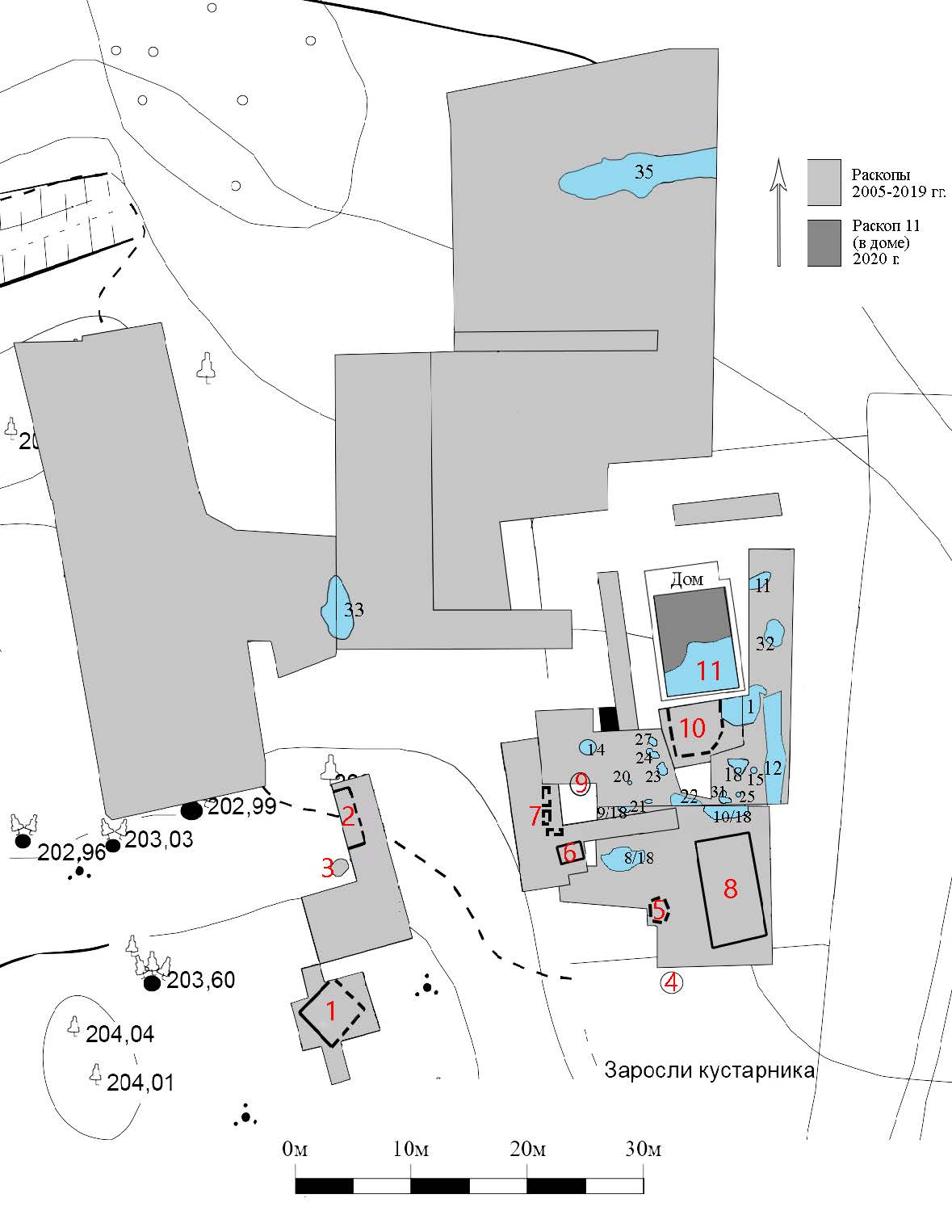 - Сводный план раскопов (серым цветом) и наиболее значимых объектов. Голубым цветом обозначены материковые ямы, черным цветом указаны их полевые номера. Красными цифрами обозначены: 1 — остатки фундамента жилой постройки в раскопе 2 2005 г.; 2 — остатки фундамента в раскопе 2008 г.; 3 — колодец (раскоп 2019 г.); 4 и 9 — «курганы»; 5 — фрагмент кирпичной кладки, раскоп 2018 г.; 6 — остатки печи, раскоп 2009 г.; 7 — скопление камней и кирпичей в раскопе 2009 г.; 8 — фундамент хозяйственной постройки в раскопе 2018 г.; 10 — фундамент «людской» — кухни существующего дома; 11 — погреб под существующим домом.