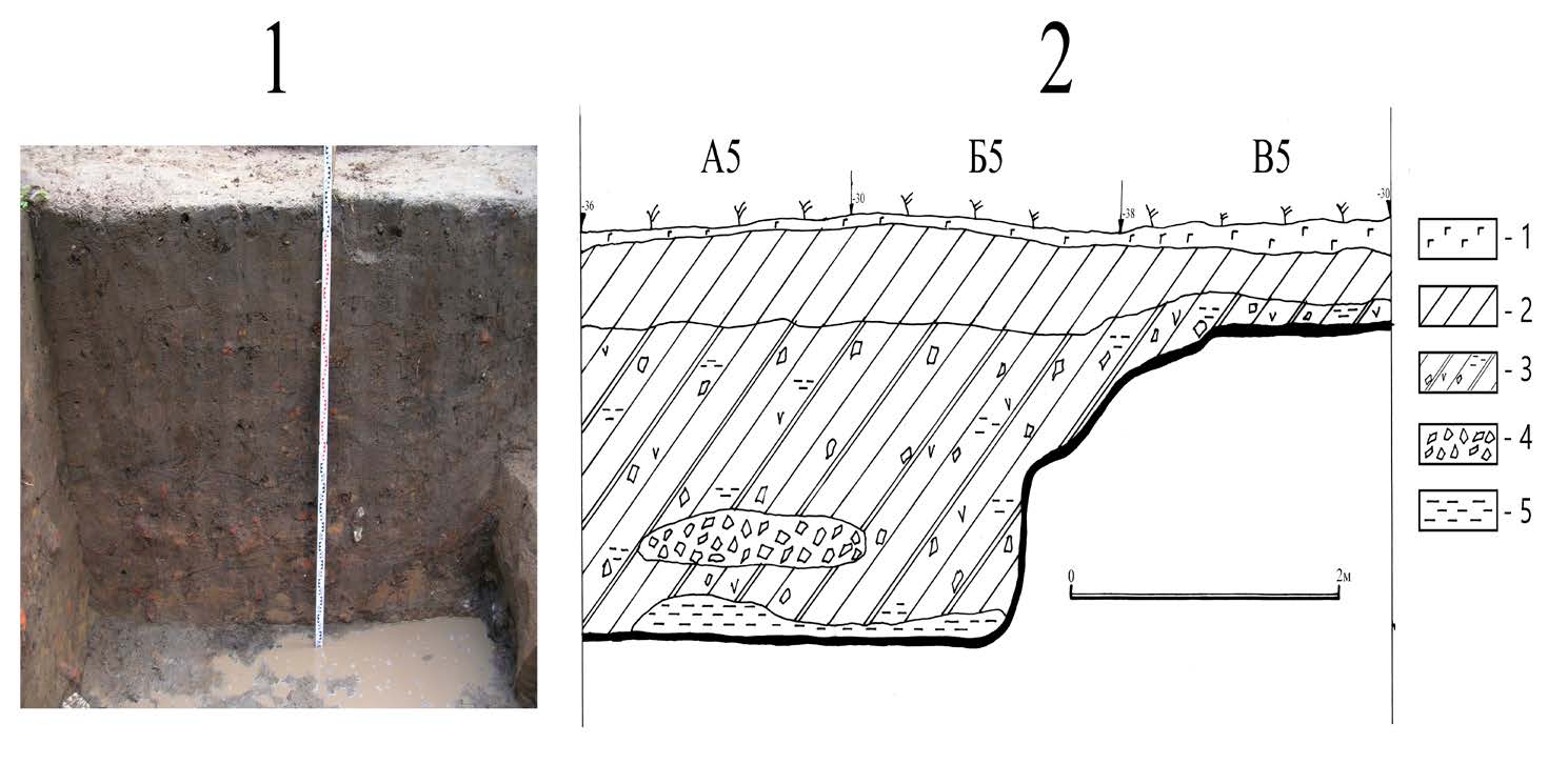 - Фото и чертеж профиля восточной стенки ямы 1 (раскоп 1 2005 г.). 1 — дерн, 2 — серый суглинок, 3 — смесь желтого материкового и серого гумусированного суглинков с кирпичным боем, 4 — кирпичный бой, 5 — скопления прокаленной глины.