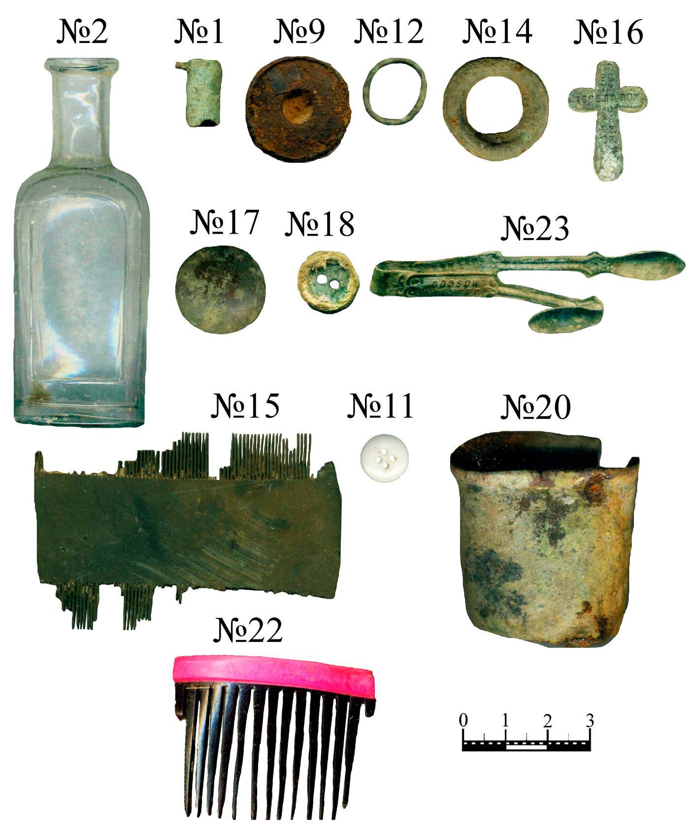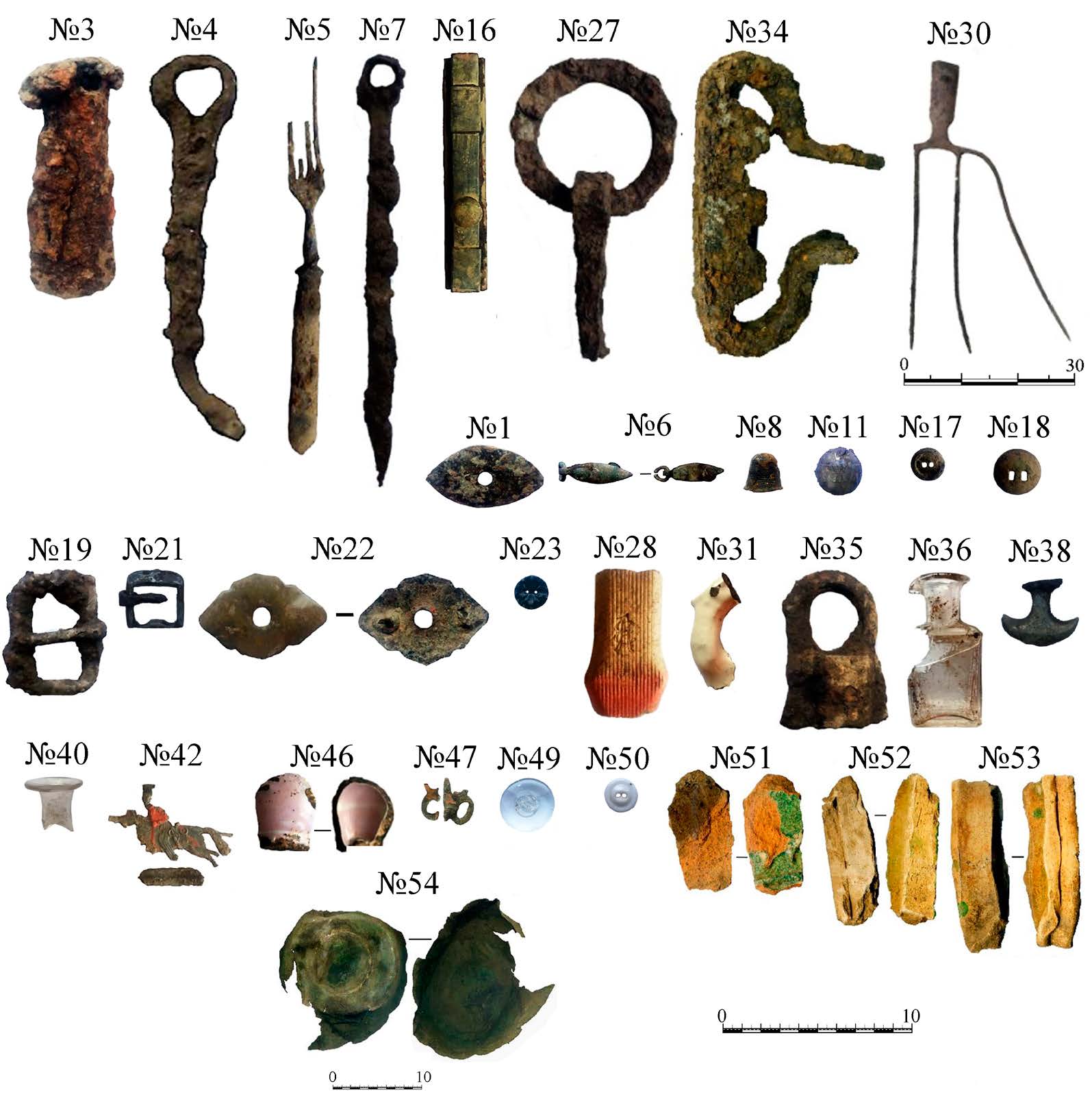 - Предметы из раскопа 2018 г. №№ 3–7, 27, 19, 30, 34, 35 — железо; №№ 1, 6, 8, 17, 18, 16, 21, 22, 23, 38, 54 — медный сплав; 42 — олово; №№ 28, 31, 51–53 — керамика (на предмете № 28 вензель с буквами А и Е); 46 — фаянс; №№ 11, 36, 40 — стекло; №№ 49–50 — фарфор (глухое стекло?).